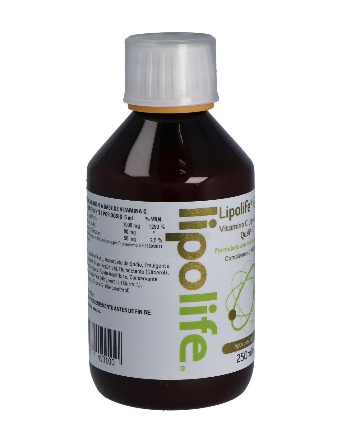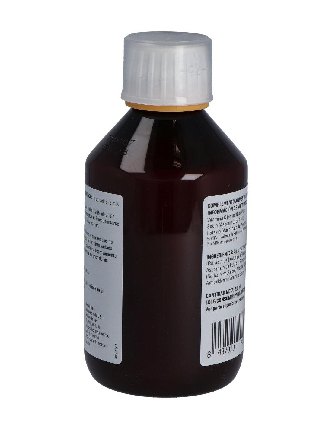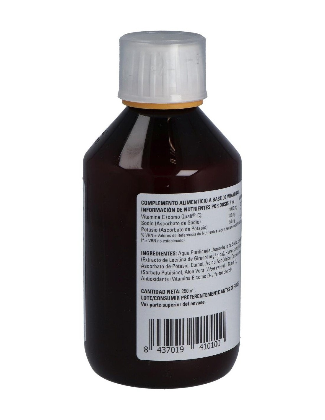 Complemento alimenticio elaborado a base de vitamina C y apto para veganos. Formulado con aloe vera, ascorbato de potasio, ascorbato de sodio, glicerol, lecitina de girasol, quali®-c, sorbato potásico y vitamina e entre otros. El producto presenta formato de 250ml. Puede tomarse directamente o mezclado con agua o zumo.