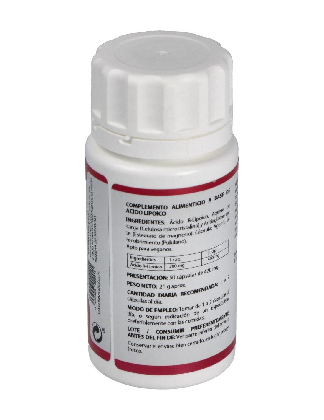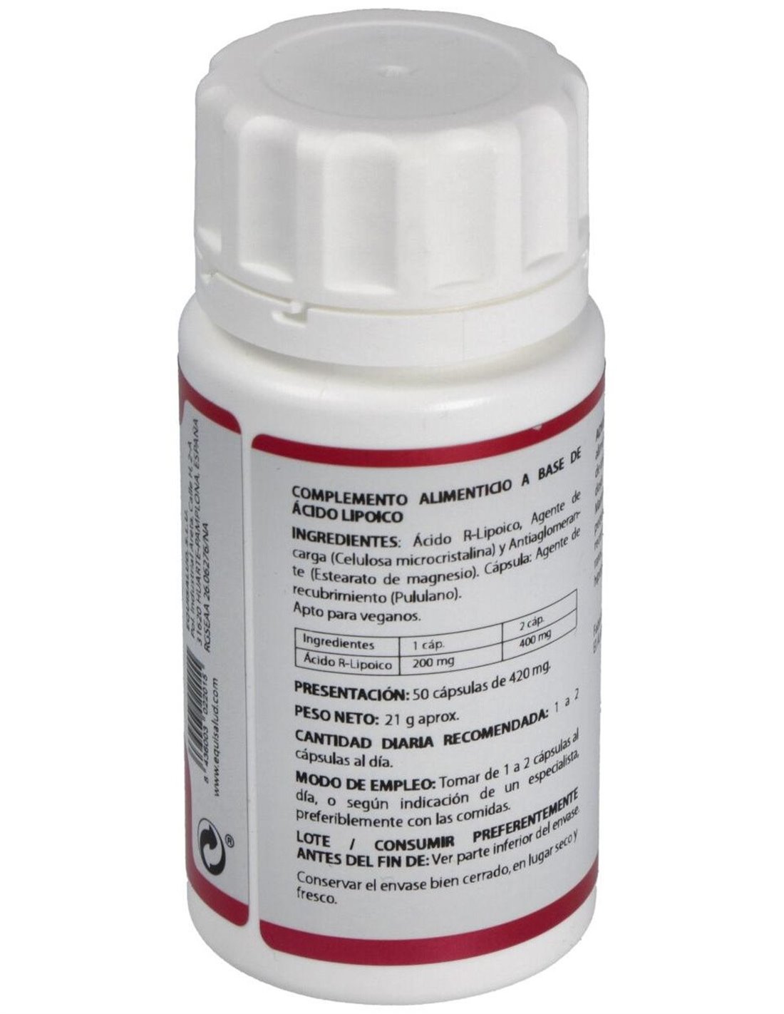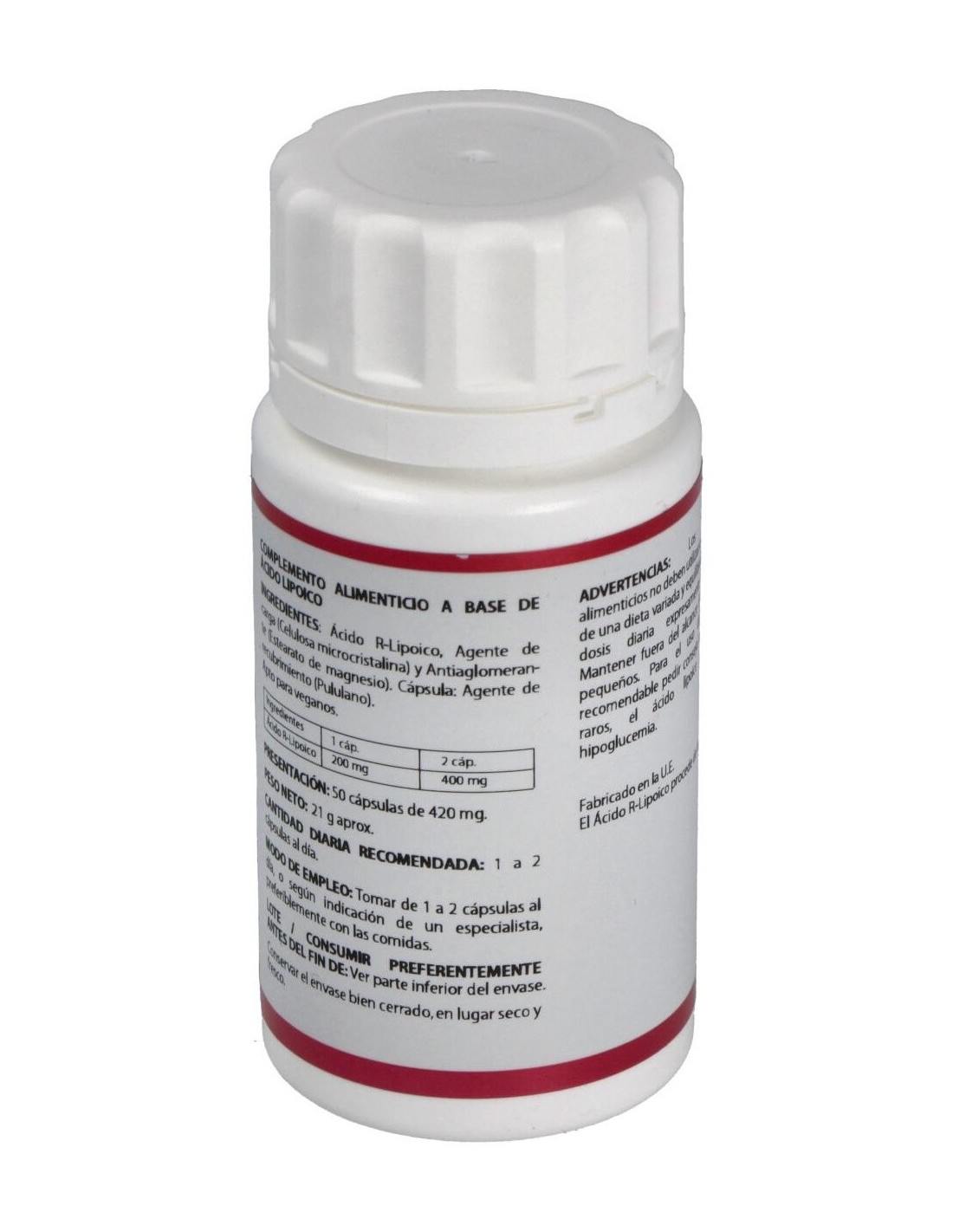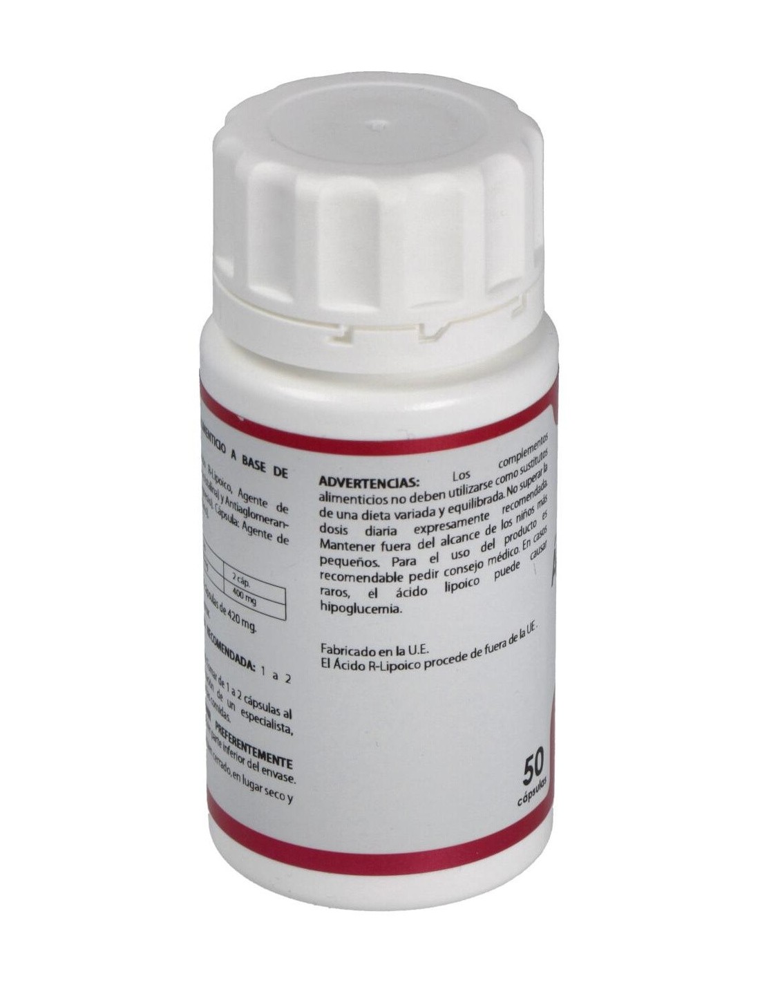 Por 1 cápsula: Ácido alfa-lipoico (100 mg), Celulosa microcristalina, Estearato de magnesio, Polisacárido de origen vegetal (pululano).
