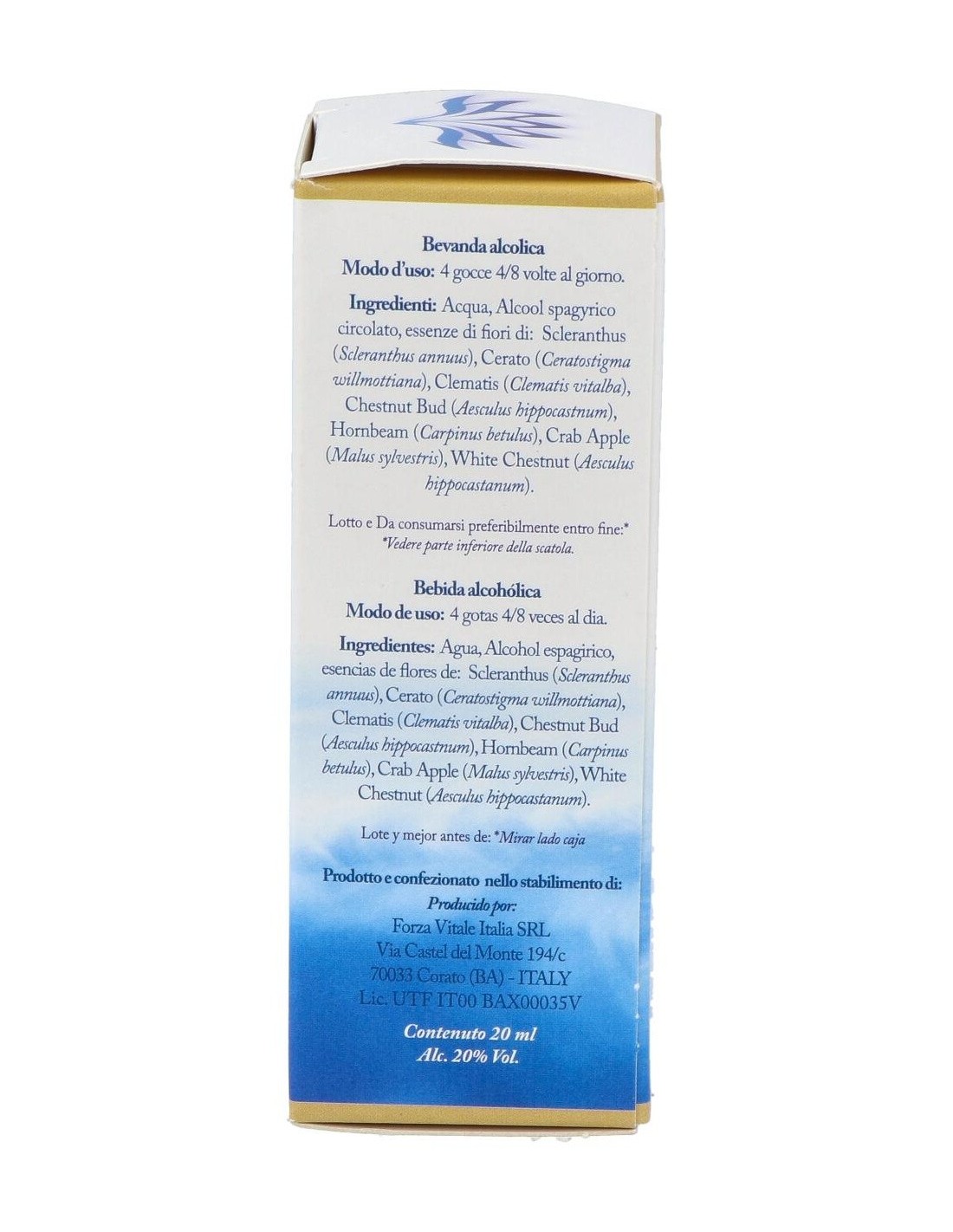 Scleranthus (Scleranthus annuus), Cerato (Ceratostigma willmottiana), Clematis (Clematis vitalba), Chestnut Bud (Aesculus hippocastanum), Hornbeam (Carpinus betulus), Crab Apple (Malus sylvestris), White Chestnut (Aesculus hippocastanum), Alc. 10% Vol.