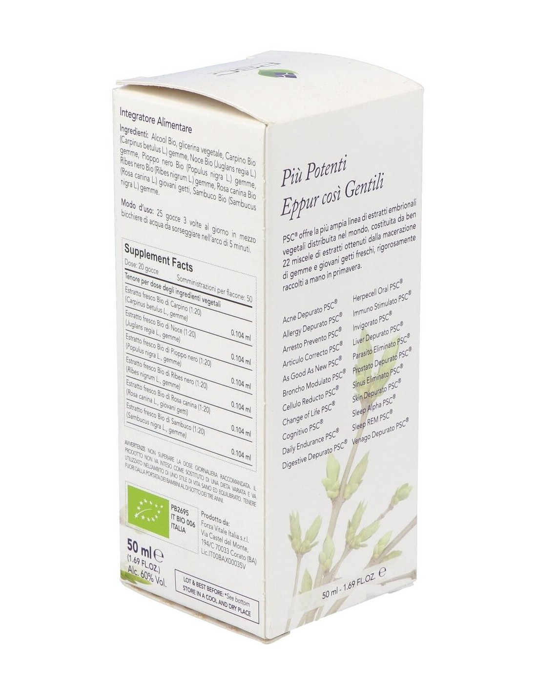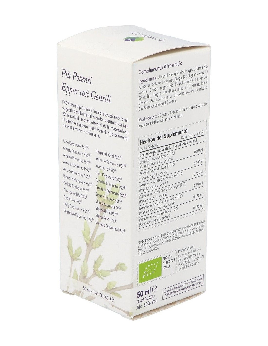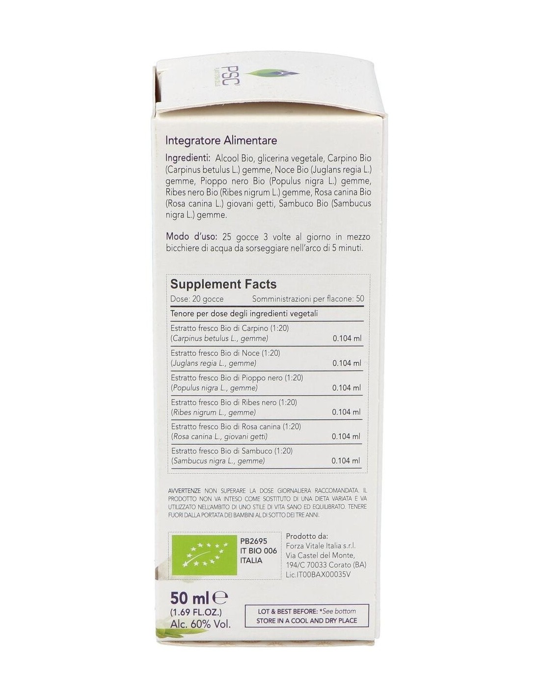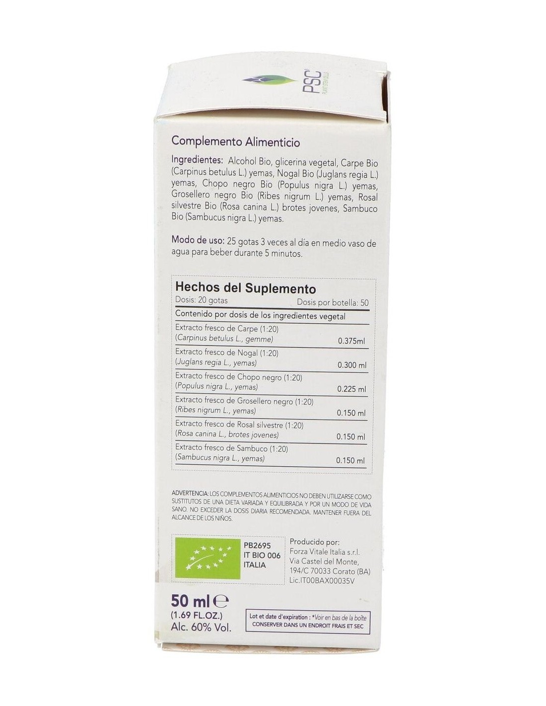Alcohol, glicerol, Grosellero negro Bio* (Ribes nigrum L.) yemas: Sambuco Bio* (Sambucus nigra L.) yemas, Chopo negro Bio* (Populus nigra L.) yemas, Rosa canina Bio* (Rosa canina L.) yemas, Carpino Bio* (Carpinus betulus L.) yemas, Nogal Bio* (Juglans regia L.) yemas.