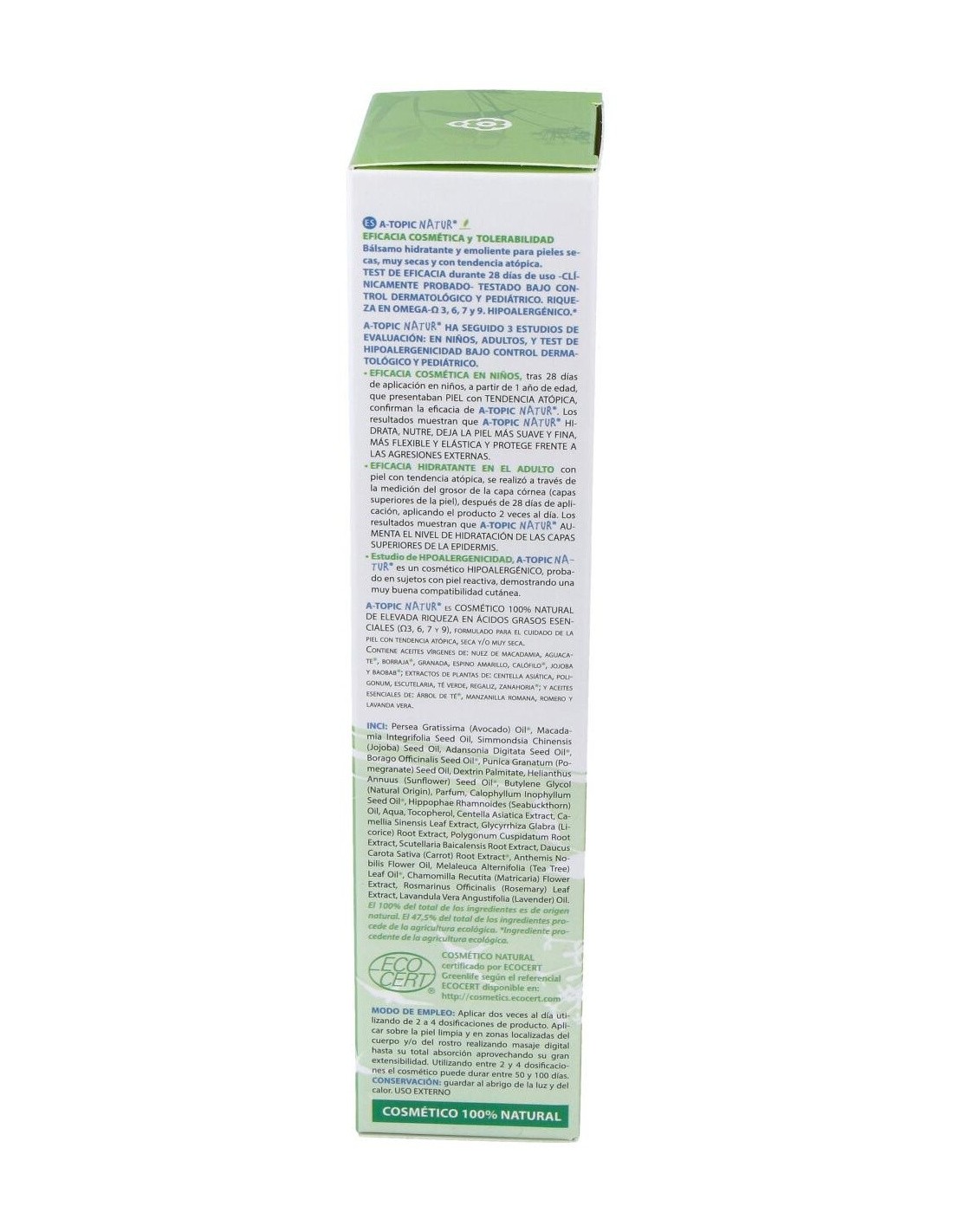 En nuestro país, se calcula que entre el 5 y el 10 por ciento de los niños pueden padecer en algún momento de su infancia dermatitis atópica. La dermatitis atópica es una alteración de la piel que aparece en la cara y el cuerpo de bebés, niños y adultos. A-Topic Natur es una una innovadora fórmula para niños y adultos, basada en la fitocosmética de alta calidad, para el cuidado natural de las pieles con tendencia atópica, sensibles, secas y muy secas. Fórmula con extractos de plantas y de gran riqueza en ácidos grasos esenciales (omega 3, 6, 7 y 9), para la nutrición e hidratación profunda de la piel, la línea este bálsamo 100% natural se encuentra clínicamente probado. Ingredientes: