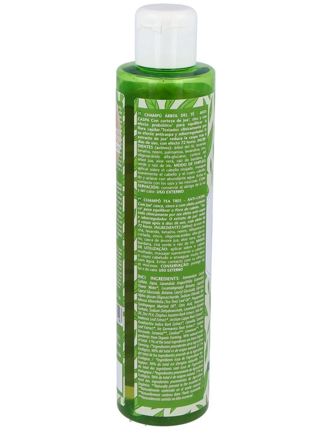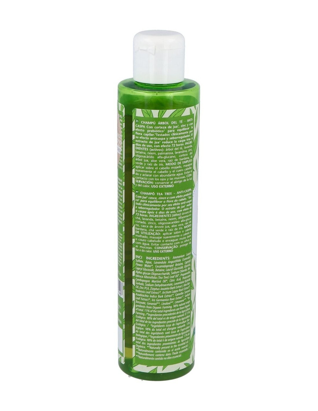 Árbol del té, lavanda, betaína, neem, palmarosa, lavandina, zinc, oligosacárido alfa glucano, corteza del árbol jua, aloe vera, raíz de bardana, té verde y raíz de iris.
