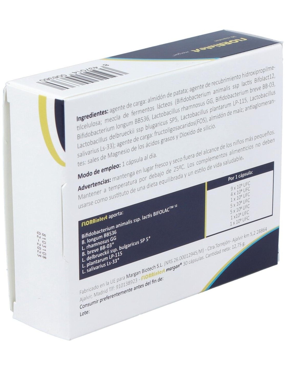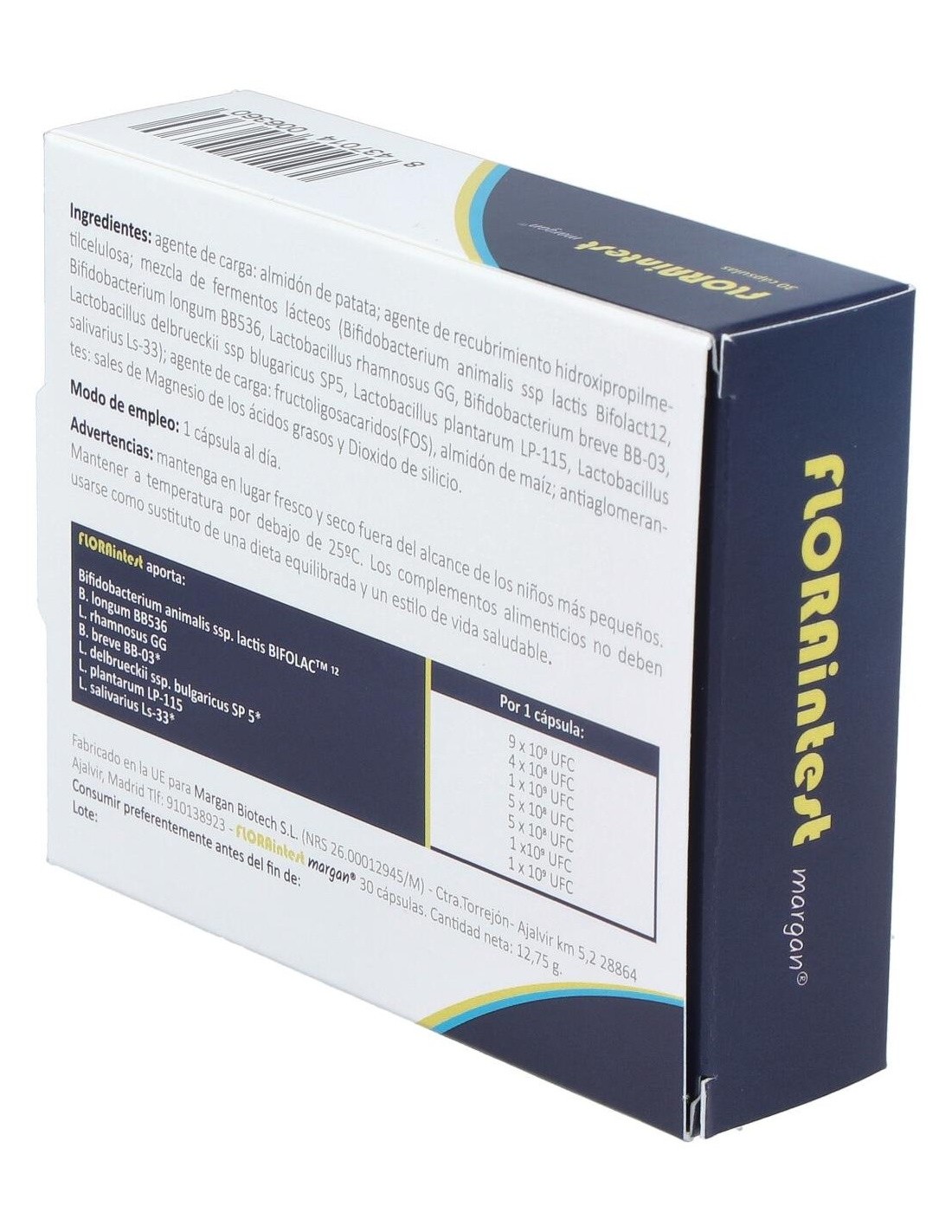 Agente de carga: almidón de patata: agente de recubrimiento hidroxipropilmetilcelulosa: mezcla de fermentos lácteos (Bifidobacterium animalis ssp lactis Bifolact12, Bifidobacterium longum BB536, Lactobacillus rhamnosus GG, Bifidobacterium breve BB-03, Lactobacillus delbrueckii ssp blugaricus SP5, Lactobacillus plantarum LP- 115, Lactobacillus salivarius Ls-33): agente de carga: fructoligosacaridos (FOS), almidón de maíz: antiaglomerantes: sales de Magnesio de los ácidos grasos y Dióxido de silicio.