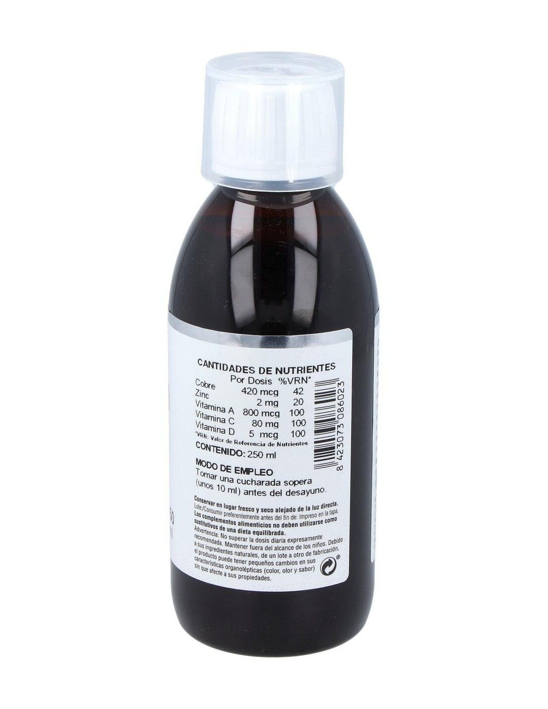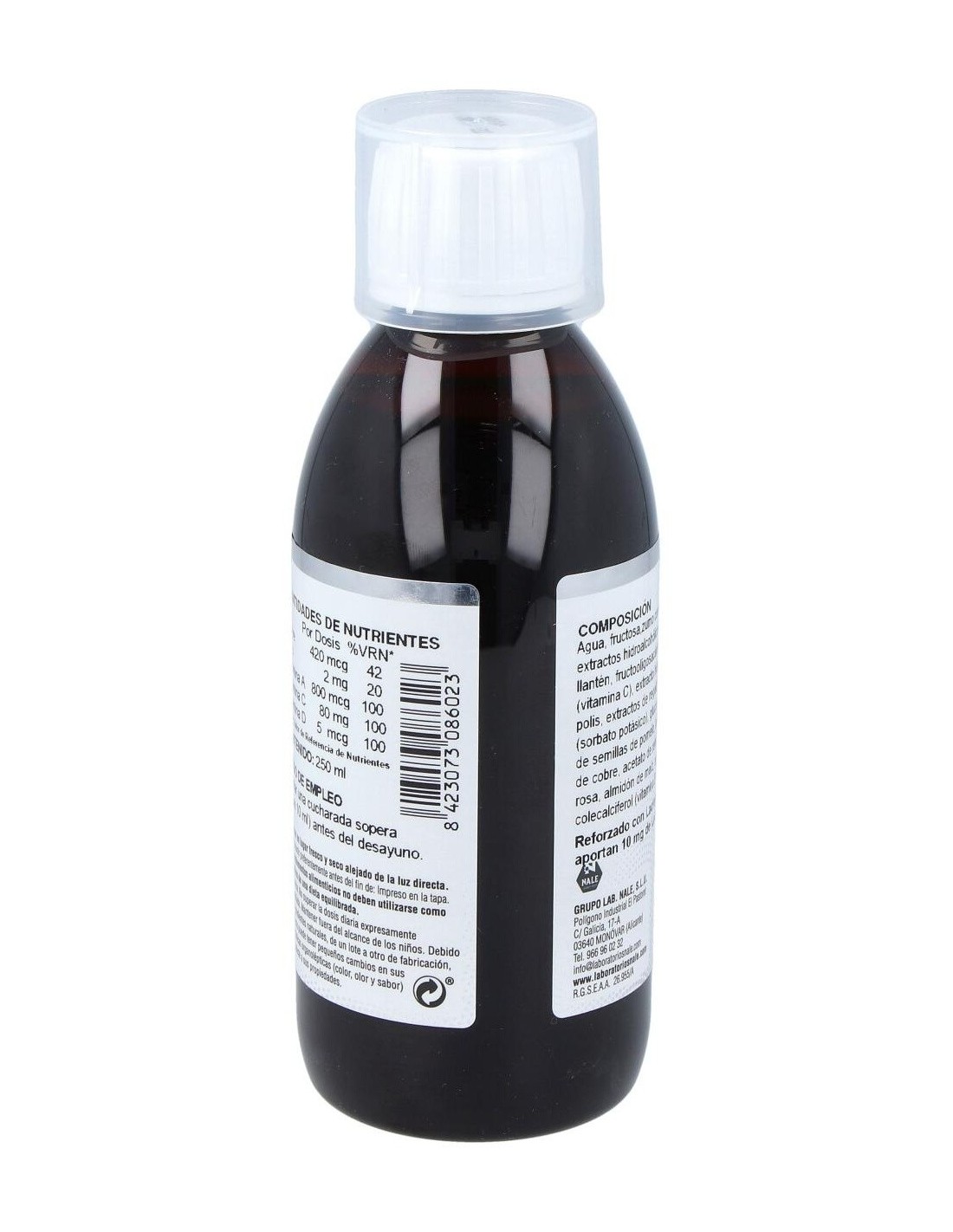 Agua: Xilitol: Concentrado de Saúco: Ext. Seco de Tomillo: Extracto de Llantén: Fructooligosacáridos: Vitamina C (AcL-Ascorbico): Gluconato de Zinc: L-Cisteina: Ext. Seco de Regaliz: Ext. Seco de Propóleo: Gluconato de Cobre: Ext. Seco de Reishi: Lactoferrina: Conservador (Sorbato potásico): Vitamina A (Palmitato de retinilo): Ext. Seco de Pomelo: Vitamina D (Colecalciferol): Acidulante (Ac. Cítrico).