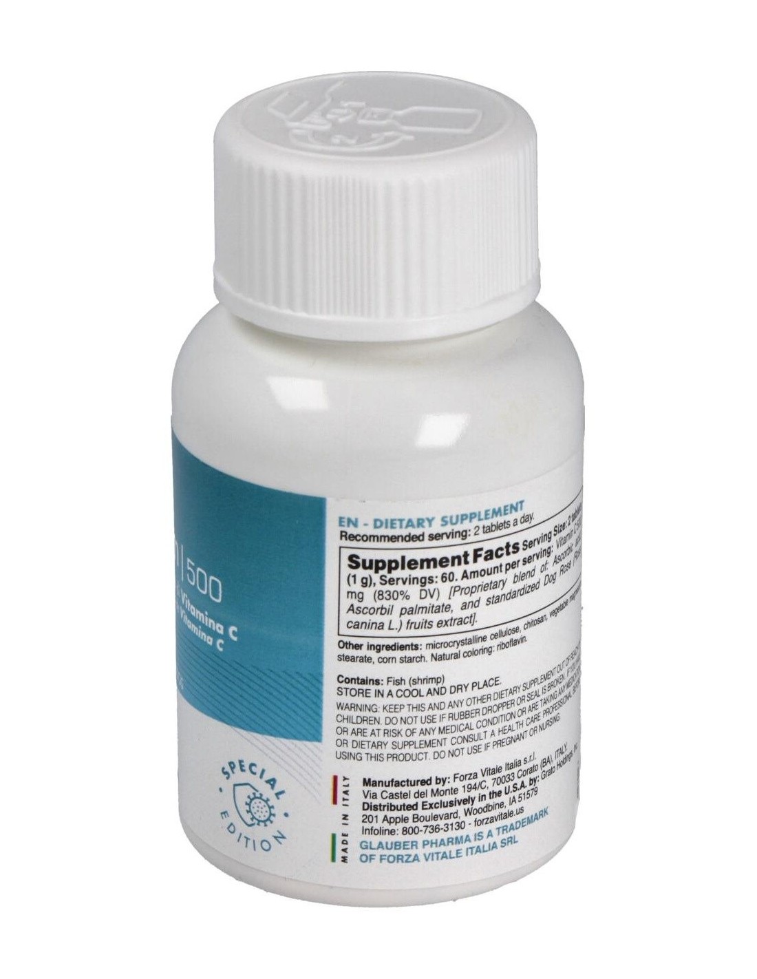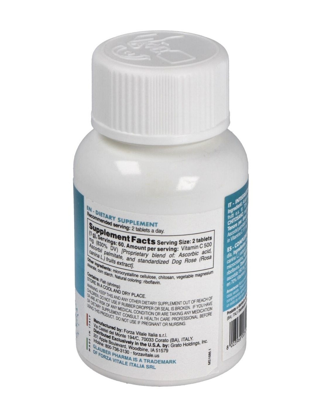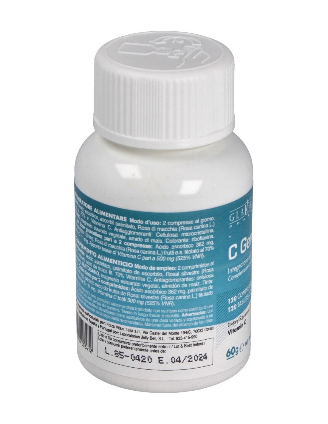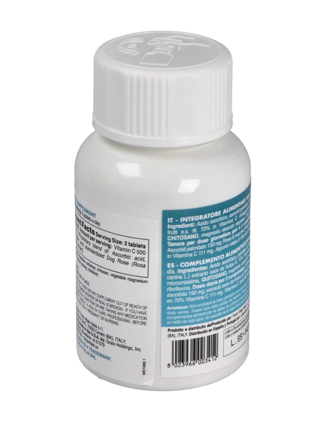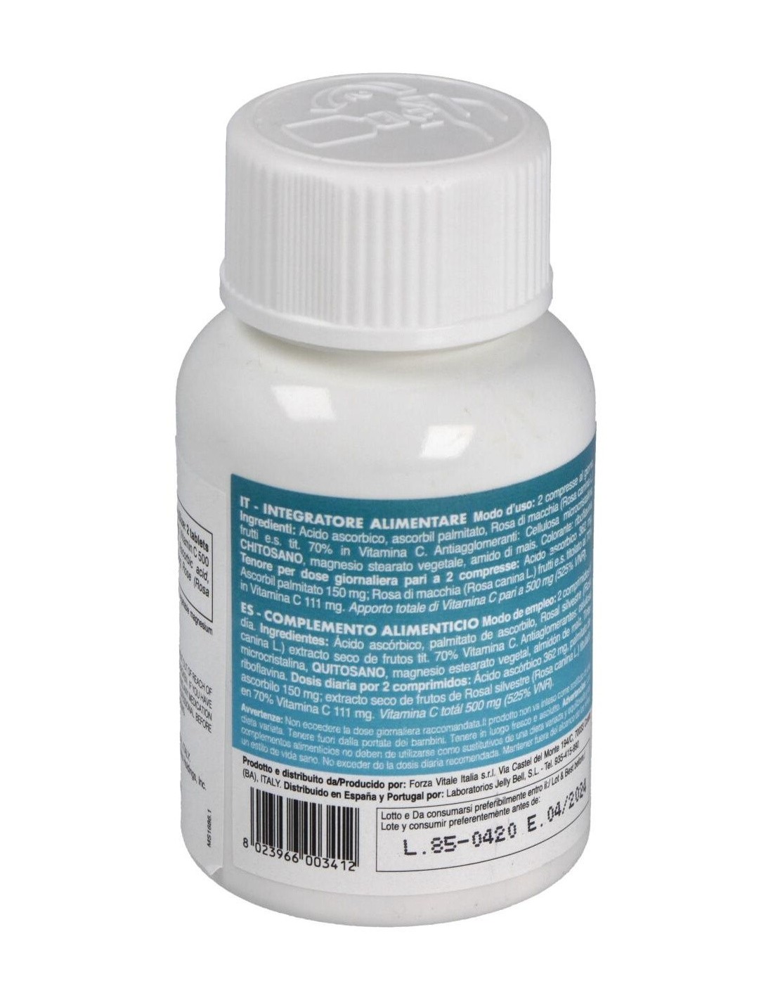 Ácido Ascórbico, Ascorbil palmitato, Rosal silvestre frutos extracto titulado 70% en vitamina C, Antiaglomerantes: Celulosa microcristalina, Quitosano, magnesio estearato vegetal, bióxido de silicio. Agentes de revestimiento :hidroxipropil-metil-celulosa, polidextrosa, titanio bióxido, talco, maltodextrinas, triglicéridos de los ácidos grasos. Colorante: riboflavina.