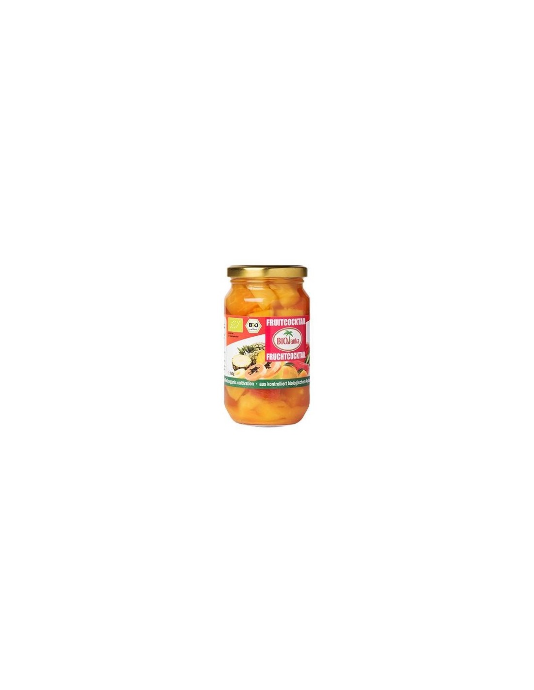 El cóctel de frutas es un placer hecho de mangos aromáticos madurados al sol, piñas, papayas y sandia. El sabor afrutado se conserva gracias al procesamiento rápido y suave de la fruta recién cosechada y bañada por el sol. ¡Seleccionado a mano, todo el mundo de la fruta en un tarro!. Ingredientes: Piña *, mango *, papaya *, sandía *, jugo de piña *. * de cultivo orgánico certificado