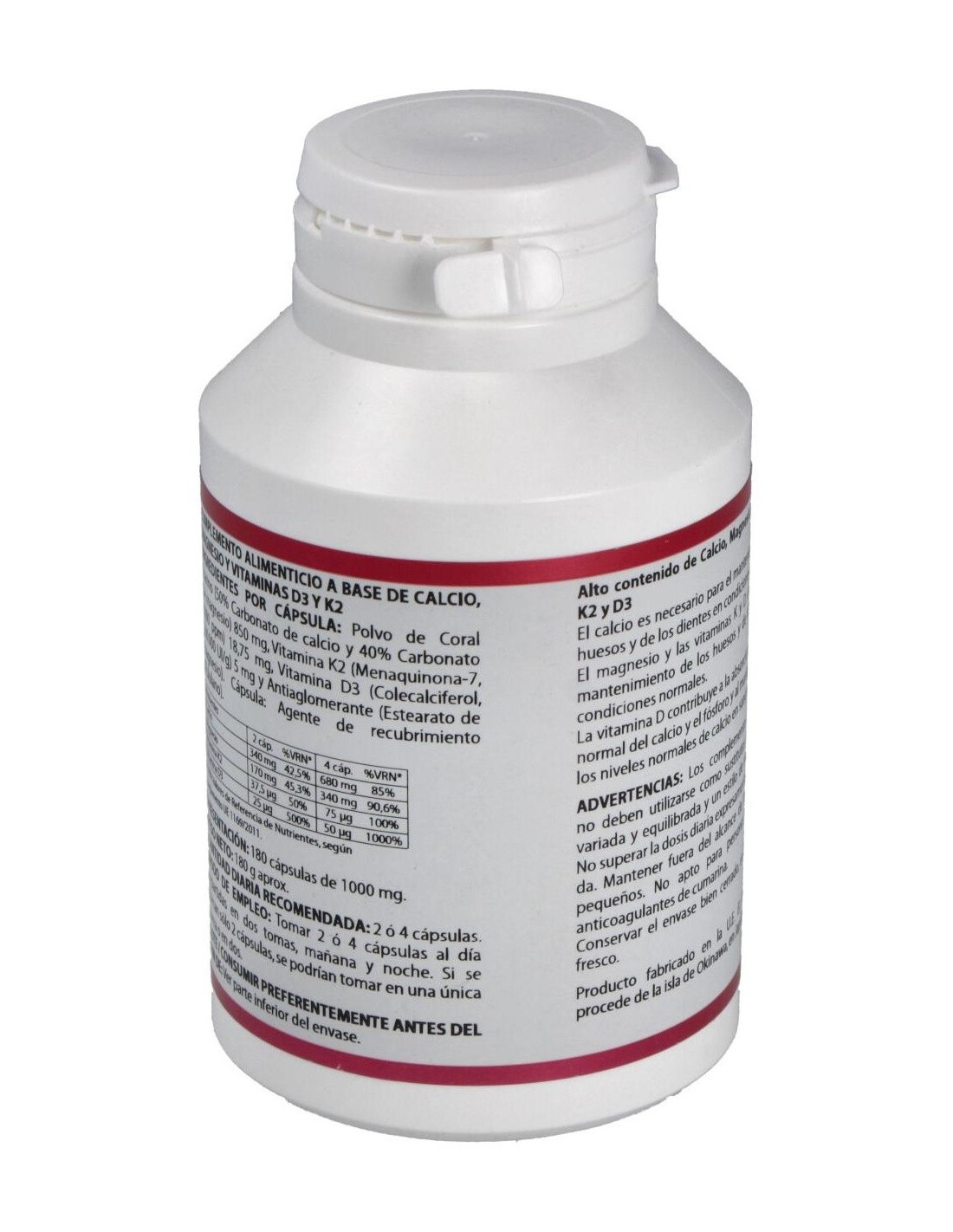 Coralsol® SMP 44* (coral marino polvo, 50% carbonato de calcio (40% calcio) y 40% carbonato de magnesio (25% magnesio)), 850 mg: Menaquin Gold (vitamina K2 (menaquinona-7) 1.000 ppm), 18,75 mg: vitamina D3 (colecalciferol, 100.000 UI/g), 5 mg. Excipiente tecnológico: estearato de magnesio (antiaglomerante), c.s. Envoltura: polisacárido de origen vegetal (pululano)