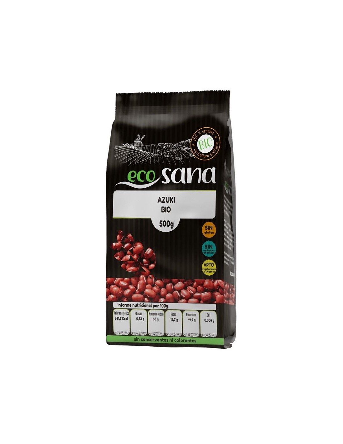 Modo de empleo:Ponerla a remojo desde la noche anterior, después tirar este agua. Ponemos 3 medidas de agua por una de azuki en una cazuela y después de ebullición, tapamos y bajamos la intensidad del fuego hasta que los granos de azuki se puedan aplastar fácilmente.Presentación:Envase de 500 gramos.Recomendaciones y advertencias:Producto vegano. No contiene gluten, aditivos ni conservantes. No OMG. Puede contener trazas de Frutos de cáscara, Sésamo y Soja.