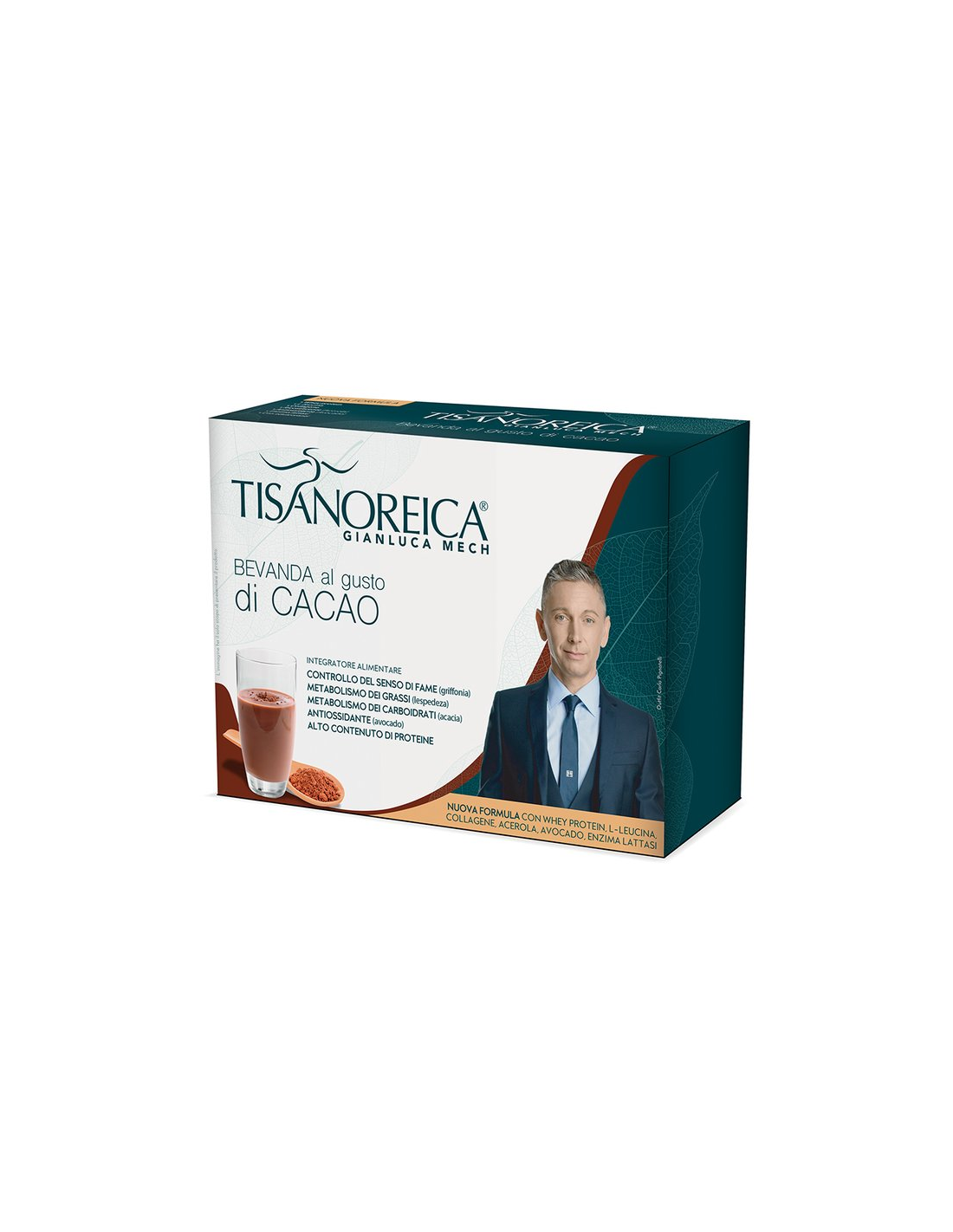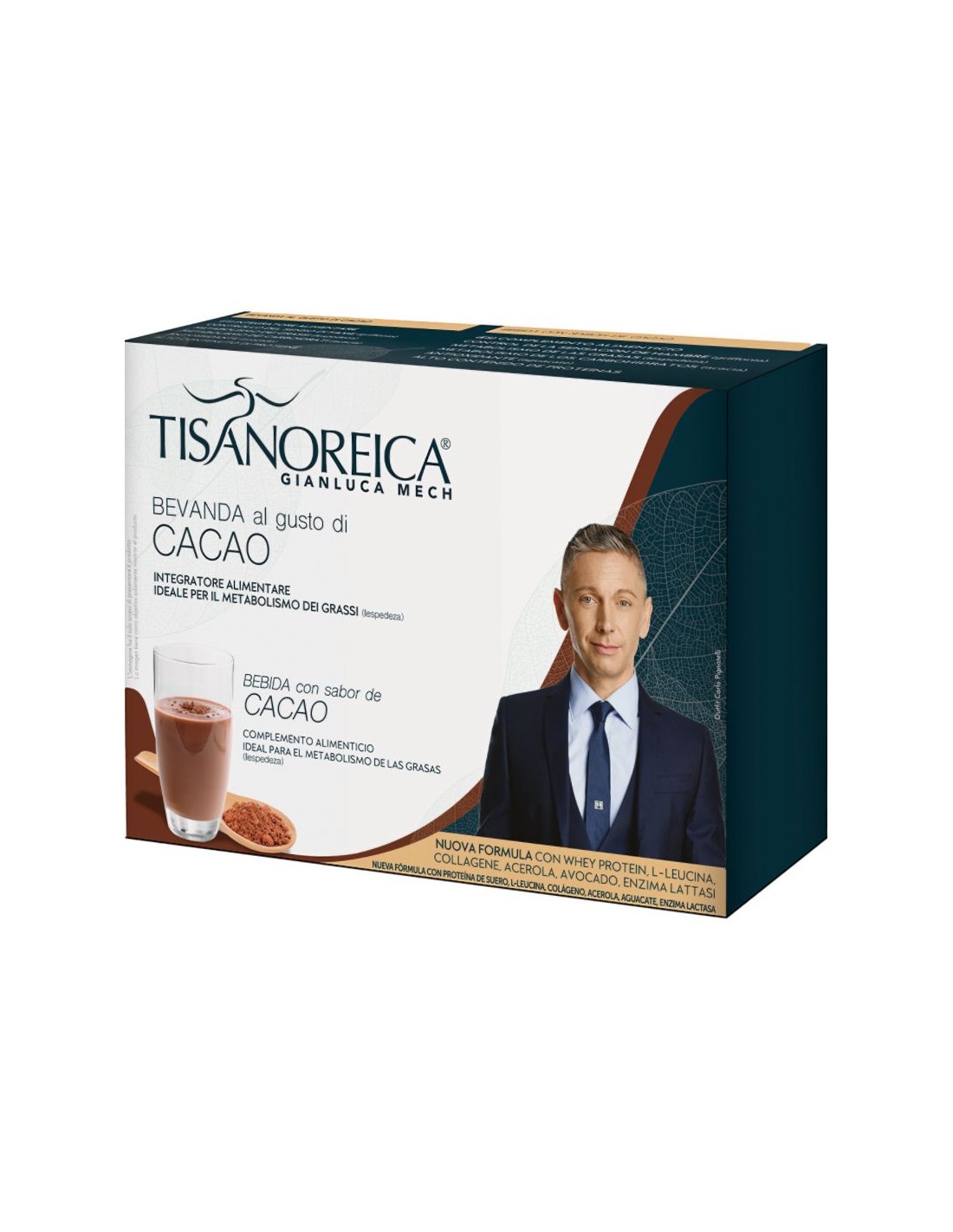 Ingredientes:Proteínas de la leche (caseinato de calcio (derivado de la leche), (proteína de suero (proteínas del suero de leche hidrolizadas, proteínas del suero de leche aisladas) (6,4 %)), emulsionante: lecitinas), cacao en polvo (20,3 %), colágeno bovino hidrolizado, Activador Tisanoreica® (acacia fibra (Acacia seyal Delile) goma, papaya e.s. (Carica papaya L.) extracto fruta, piña zumo (Ananas comosus (L.) Merr.) extracto fruta, malva es. (Malva sylvestris L.) extracto flor, anís estrellado es. (Illicium verum Hook.f.) extracto fruta, hinojo es. (Foeniculum vulgare Mill.) extracto fruta, alcachofa e.s. (Cynara scolymus L.) extracto hoja, diente de león es. (Taraxacum officinale (L.) Weber ex F.H.Wigg.) extracto hoja, e.s. (Lespedeza capitata Michx.) extracto partes aéreas, grittonia es. (Griffonia simplicifolia (DC.) Baill.) extracto semilla, frángula e.s. (Rhamnus frangula L.) corteza) (7,9 %), sal, aromas, inulina de achicoria, Lleucina, acerola zumo (Malpighia punicifolia L.) extracto fruta, agentes antiaglomerantes: carbonato de magnesio, edulcorante: aspartame, aguacate zumo (Persea americana Mill) extracto fruta, melón zumo (Cucumis melo L.) extracto fruta (maltodextrinas, zumo de melón liofilizado, agente de recubrimiento: E904), lactasa.Valor nutricional por 100 gramos: