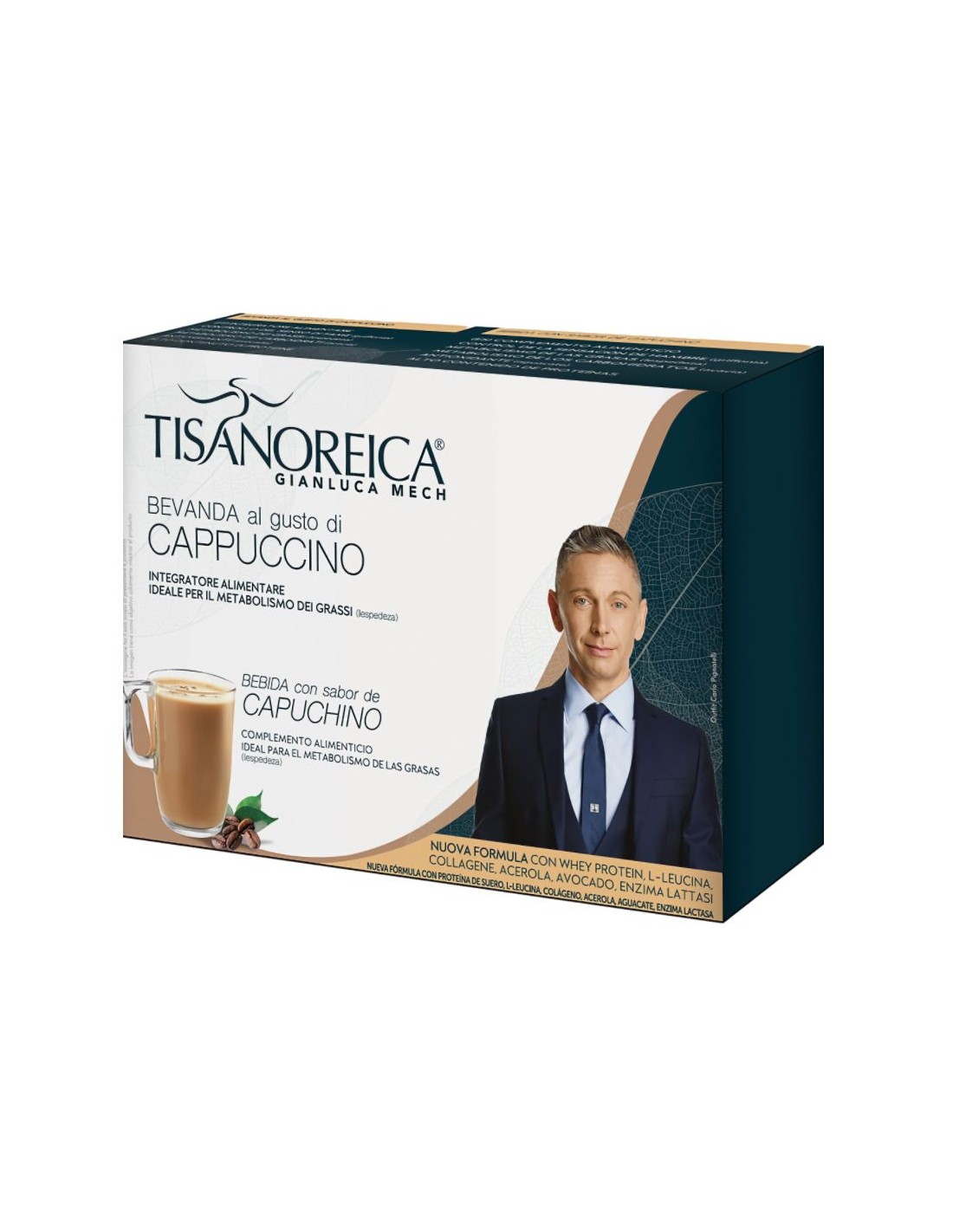 Ingredientes:proteínas de la leche (caseinato de calcio (derivado de la leche), (proteína de suero (proteínas del suero de leche hidrolizadas, proteínas del suero de leche aisladas) (7,1 %)), emulsionante: lecitina), colágeno bovino hidrolizado, Activador Tisanoreica® (acacia fibra (Acacia seyal Delile) goma, papaya e.s. (Carica papaya L.) extracto fruta, piña zumo (Ananas comosus (L.) Merr.) extracto fruta, malva é.s. (Malva sylvestris L.) extracto flor, anís estrellado es. (Illicium verum Hook.f.) extracto fruta, hinojo es. (Foeniculum vulgare Mill.) extracto fruta, alcachofa e.s. (Cynara scolymus L.) extracto hoja, diente de león e.s. (Taraxacum officinale (L.) Weber ex F.H.Wigg.) extracto hoja, lespedeza es. (Lespedeza capitata Michx.) extracto partes aéreas, griffonia es. (Griffonia simplicifolia (DC.) Baill.) extracto semilla, frángula es. (Rhamnus frangula L.) corteza) (8,8 %), café soluble (8 %), nata (leche) en polvo, cacao magro en polvo, L-leucina, acerola zumo (Malpighia punicifolia L.) extracto fruta, sal, aromas (contiene: leche), agente antiaglomerante: carbonato de magnesio, aguacate zumo (Persea americana Mill) extracto fruta, edulcorante: aspartame, espesante: goma xántica, melón zumo (Cucumis melo L.) extracto fruta (maltodextrina, zumo de melón liofilizado, agente de recubrimiento: E904), lactasa.Valor nutricional por 100 gramos: