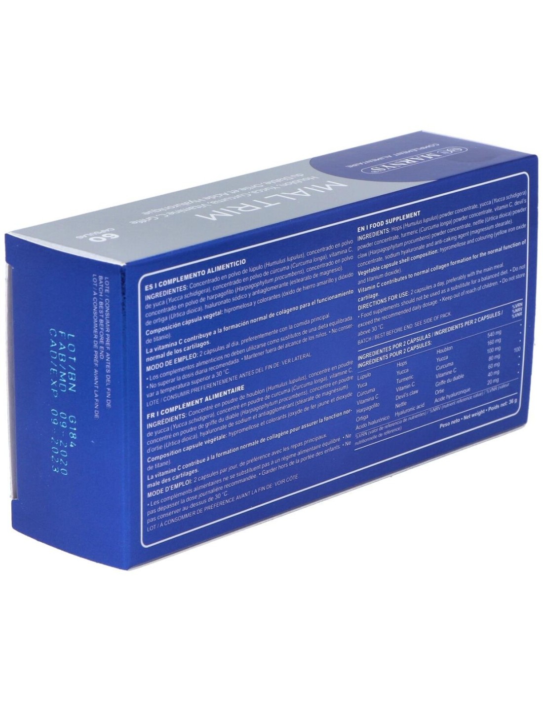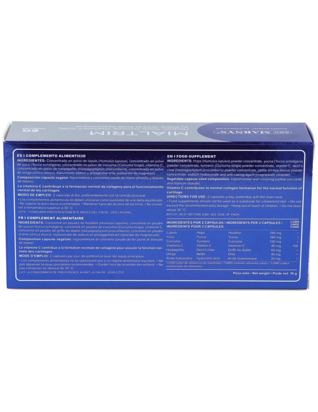 Este producto, con lúpulo, harpagofito, ortiga, cúrcuma, yuca y ácido hialurónico, usados comúnmente para el buen funcionamiento de los cartílagos, ay
