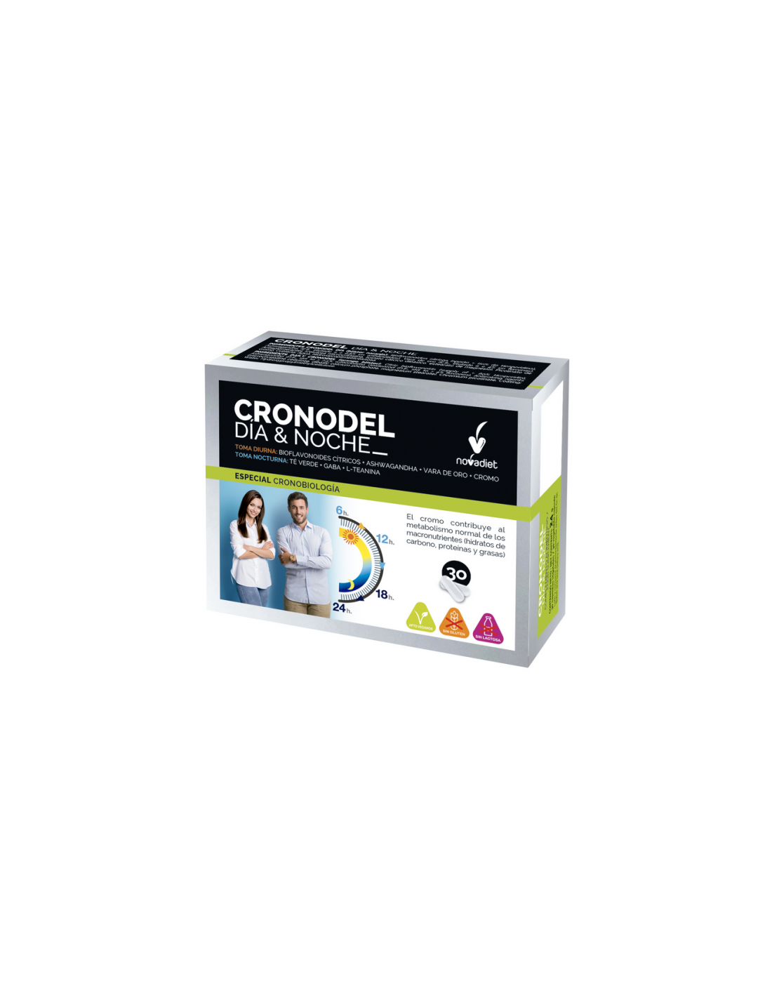 Sinergia de ingredientes que ayudan a mantener unos buenos ritmos biológicos, para una toma diurna y otra nocturna. El cromo contribuye al metabolismo normal de los macronutrientes (hidratos de carbono, proteínas y grasas). Producto vegano.