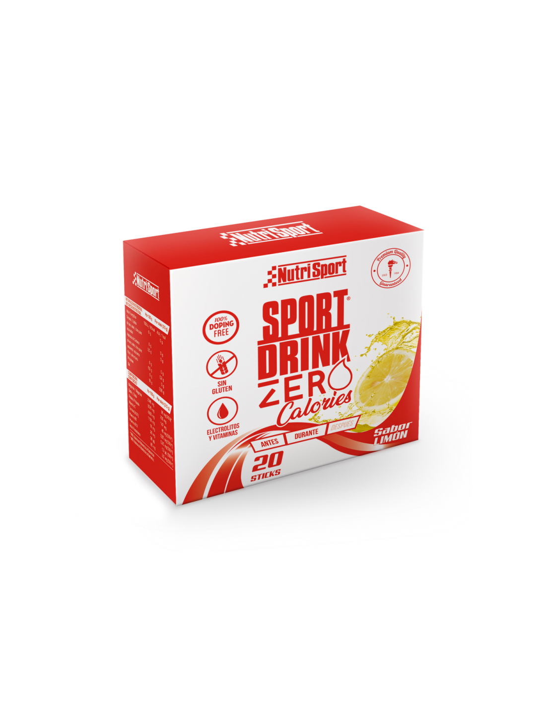 El Sport Drink Zero Calorías (Caja de 20 Sticks) Limón de Nutris es una bebida isotónica para personas activas que hidrata sin aportar calorías, gracias a su fórmula sin azúcares y sabor limón.