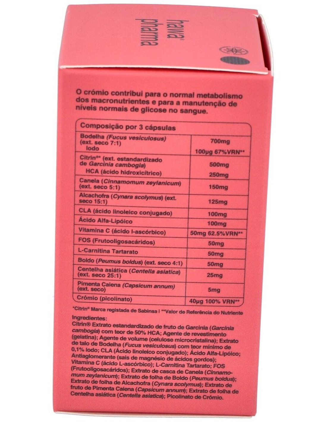 Citrin® Extracto estandarizado de fruto de Garcinia (Garcinia cambogia) contenido 50% HCA: Agente de recubrimiento (gelatina): Agente de carga (celulosa microcristalina): Extracto de talo de Sargazo vesiculoso (Fucus vesiculosus) contenido mínimo de 0.1% Yodo: CLA (Ácido linoleico conjugado): Ácido Alfa Lipoico: Antiaglomerante (sales de magnesio de ácidos grasos): Vitamina C (ácido L ascórbico): L-Carnitina Tartrato: FOS (Fructooligosacáridos): Extracto de corteza de Canela (Cinnamomum zeylanicum): Extracto de hoja de Boldo (Peumus boldus): Extracto de hoja de Alcachofa (Cynara scolymus): Extracto de fruto de Cayena (Capsicum annum): Extracto de hoja de Centella asiática (Centella asiatica): Picolinato de Cromo.