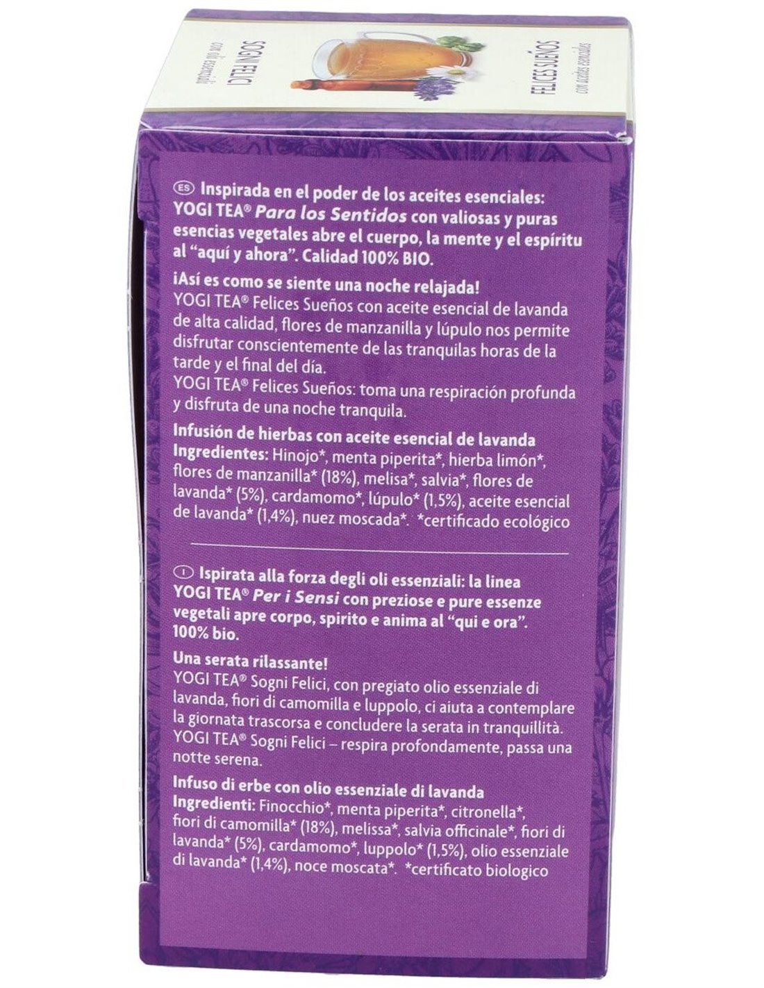 Yogi tea para los sentidos Felices Sueños con aceite esencial de lavanda de alta calidad, flores de manzanilla y lúpulo nos permiten disfrutar conscie