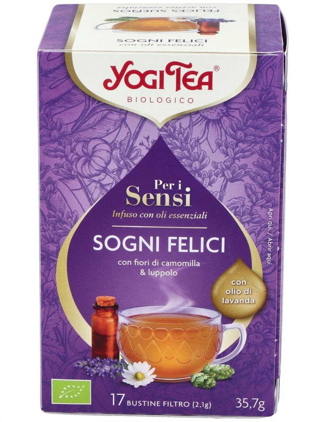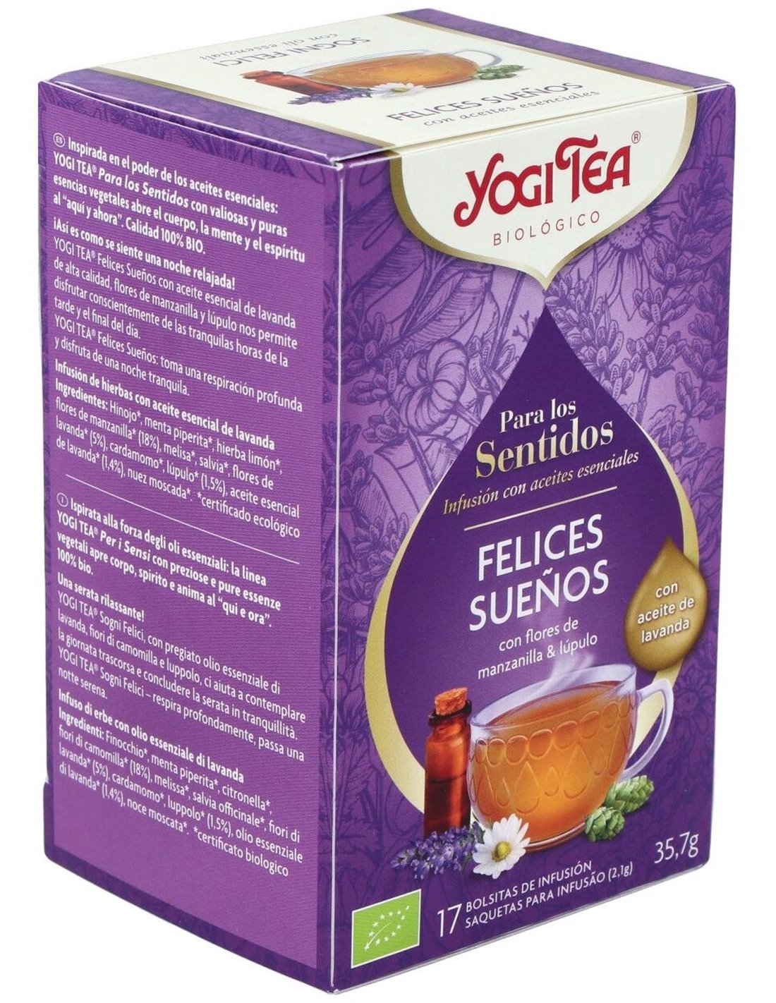 Yogi tea para los sentidos Felices Sueños con aceite esencial de lavanda de alta calidad, flores de manzanilla y lúpulo nos permiten disfrutar conscientemente de las tranquilas horas de la tarde y del final del día.Ingredientes:Hinojo*, menta piperita*, hierba limón*, flores de manzanilla*(18%), melisa*, salvia*, flores de lavanda*(5%), cardamomo*, lúpulo*(1,5%), aceite esencial de lavanda* (1,4%), nuez moscada*. (*) Ingredientes procedentes de agricultura ecológica.Modo de empleo:Verter 250 ml de agua recién hervida sobre la bolsita. Dejarla durante 5 o más para un sabor más intenso.Presentación:Envase de 17 filtros.