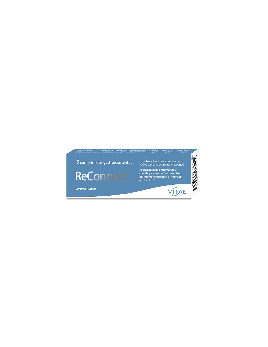 ReConnect de Vitae es un complemento alimenticio que contribuye al funcionamiento normal del sistema nervioso, la función psicológica, al metabolismo energético normal y a disminuir el cansancio y la fatiga por sus ingredientes, contribuyendo así a ayudar al organismo a afrontar el día a día en épocas de estrés, cansancio o alta actividad. Son pastillas para la memoria y la concentración.Tanto la CoenzimaQ10, el NADH, la vitamina C como la Serina, tienen fisiológicamente papeles fundamentales a nivel tanto metabólico como cognitivo en el organismo debido a su implicación en el sistema energético del mismo, entre otros. La vitamina C por ejemplo actúa como antioxidante y la Serina juega un papel esencial en la diferenciación y maduración de las neuronas y en la formación de la vaina de mielina que las protege y acelera la transmisión de impulsos, imprescindible para el rendimiento cognitivo.Princios activos: