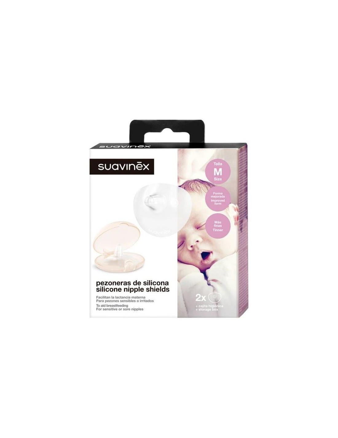 Las pezoneras de silicona ayudan a continuar con la lactancia materna a pesar de sufrir molestias o irritaciones en el pezón. Pueden utilizarse en aquellos casos en los que las madres tienen los pezones planos, retraídos o invertidos, ya que se acoplan perfectamente al seno facilitando el agarre y la succión del recién nacido. Tacto muy suave. Incluye cajita higiénica de polipropileno para guardar recién esterilizadas o transportar.
