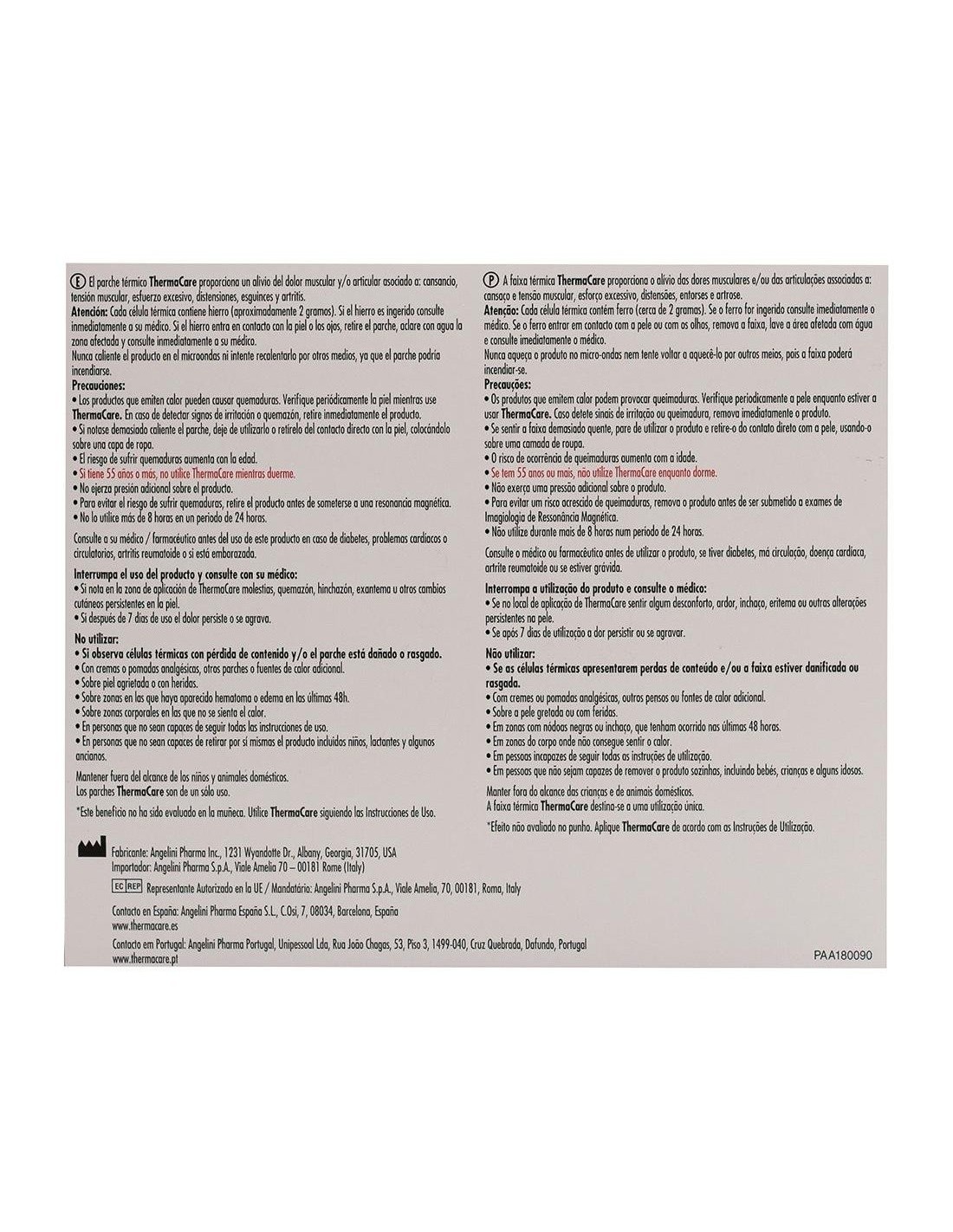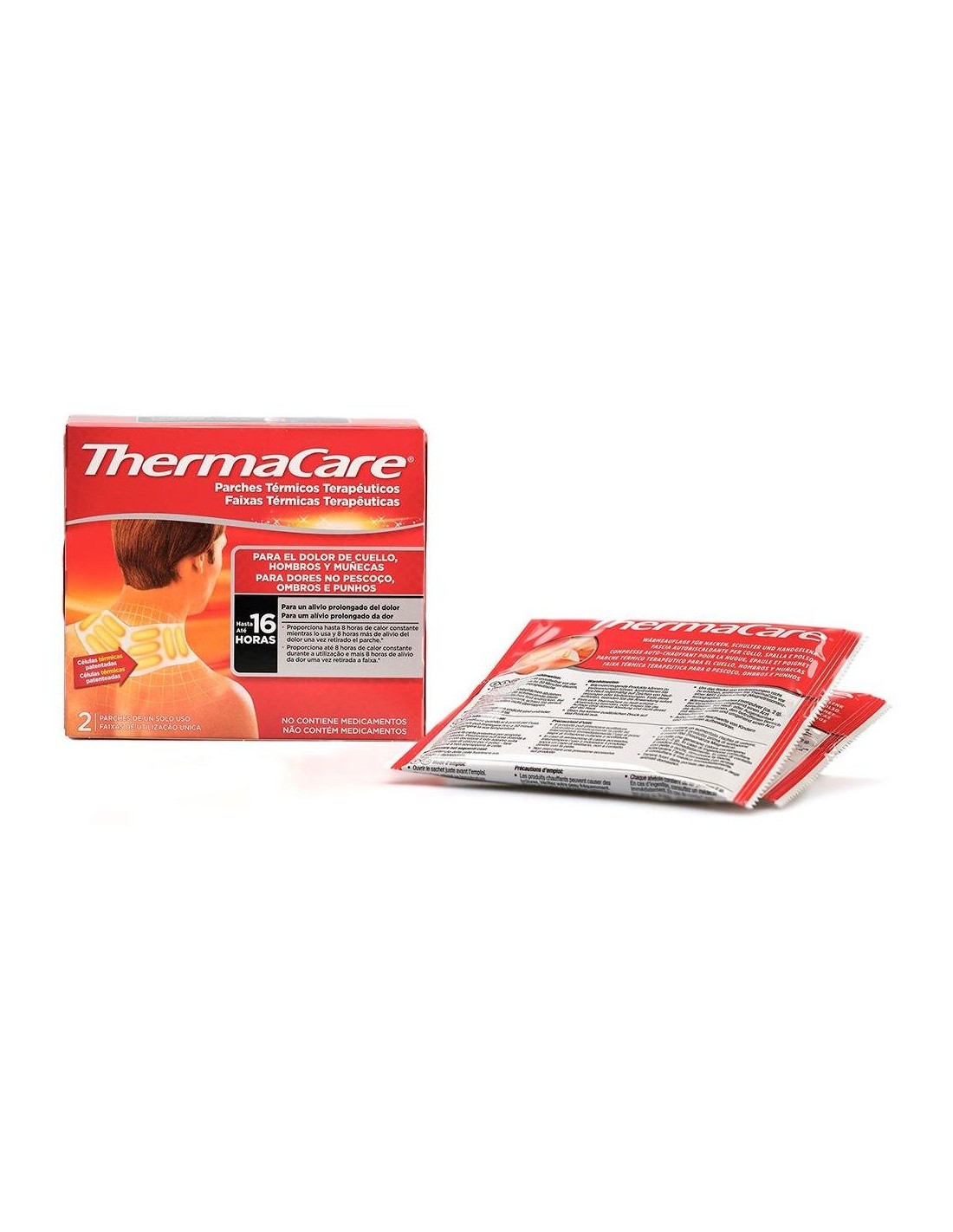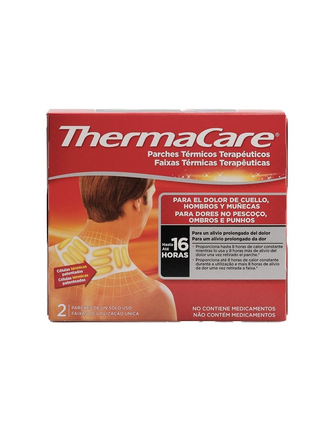 THERMACAREThermaCare® cuello, hombros y muñecas está indicado para tratar el molestias muscular y articular inespecífico en las zonas del cuello, los hombros y las muñecas. Los parches están constituidos por 10 células de calor patentadas y tienen una forma ergonómica para adherirse perfectamente a la piel a través de dos zonas adhesivas. Proporciona alivio prolongaodo durante 16 horas. Esto es, 8 horas mientras se lleva puesto y 8 horas adicionales después de quitárselo.