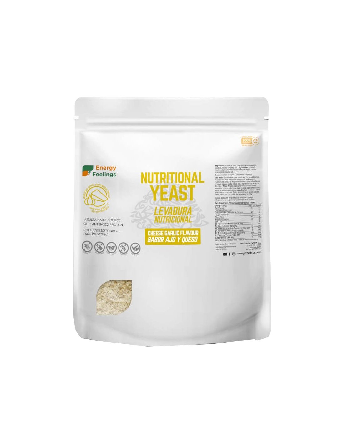 La Levadura Nutricional Sabor Ajo y Queso de Energy Feelings es un grandioso súper alimento para enriquecer el valor nutritivo de cualquier preparación. Al ser inactiva no provoca el desarrollo de levaduras en el intestino.Es inactiva y no provoca el desarrollo de levaduras en el tracto intestinal. Con 43% de proteínas biodisponibles es extraordinariamente rica en todas las vitaminas del grupo B: B1, B2, B3, B5, B6, B9. Especialmente pensado para las personas veganas y flexi veganas.A diferencia de la más comúnmente comercializada levadura de cerveza, La Levadura Nutricional Ajo Parmesano de Energy Feelings es un producto concebido para la alimentación humana, puro y limpio, libre de los residuos potencialmente tóxicos de la industria cervecera y con un delicioso sabor.La Levadura Nutricional Sabor Ajo y Queso de Energy Feelings son una fuente de proteínas, fibra dietética y vitaminas B. Puede consumirse directamente, utilizarse en recetas o espolvorearse sobre los alimentos y en las bebidas para obtener una mayor nutrición y realzar el sabor a ajo-parmesano.Propiedades: