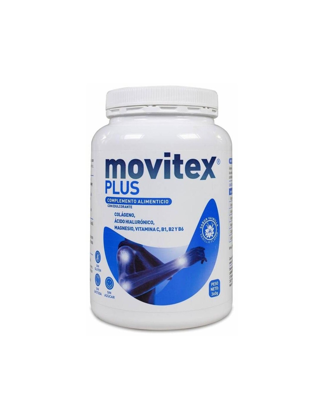 MOVITEXMOVITEX PLUS es un complemento alimenticio con edulcorante a base de colágeno, ácido hialurónico, magnesio, Vitamina C, B1, B2 y B6. La vitamina C contribuye a la formación normal de colágeno para el funcionamiento normal de los huesos y cartílagos. La vitamina C, la riboflavina (vit B2), la piridoxina (vit B6) y la tiamina (vit B1) ayudan al metabolismo energético normal. La vitamina C, la riboflavina (vit B2), la piridoxina (vit B6) ayudan a disminuir el cansancio y la fatiga. Producto sin gluten ni lactosa.