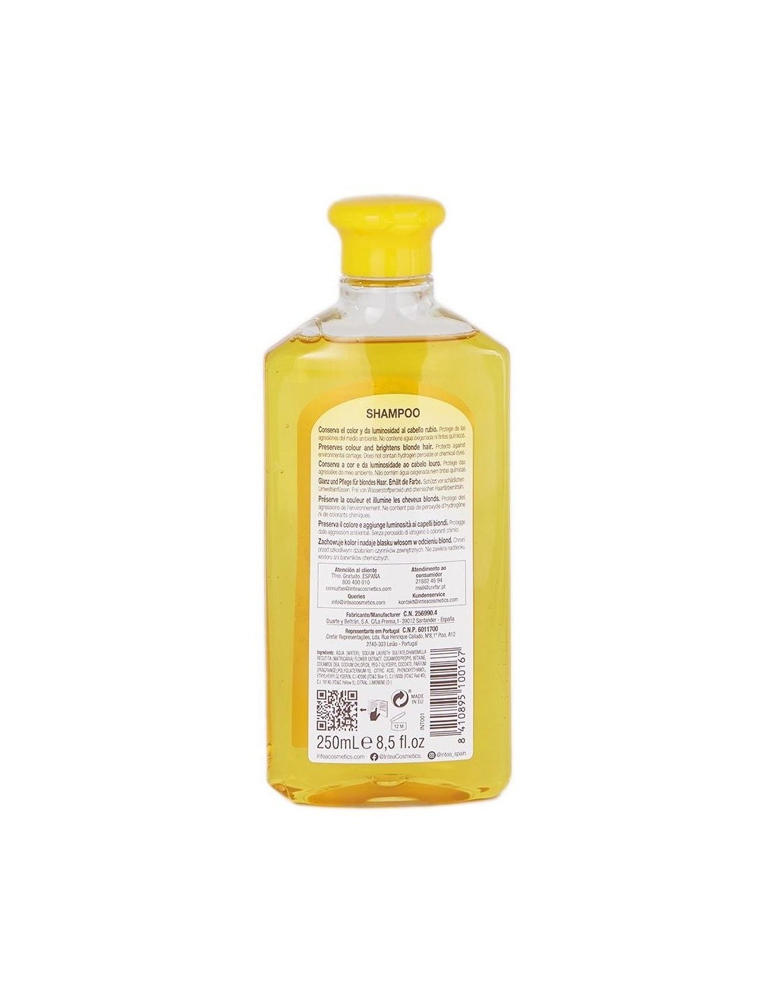 INTEAChampú indicado especialmente para el lavado de cabellos rubios ya sean naturales, teñidos o aclarados con nuestros productos. Proporciona un brillo intenso, luminosidad y reflejo al cabello rubio. Su uso habitual aclara ligeramente el cabello potenciando las mechas. Complemento ideal de los productos aclarantes Intea® para conseguir un mejor acabado. Suave y agradable olor de las flores de manzanilla. No contiene siliconas ni parabenos. No testado en animales.