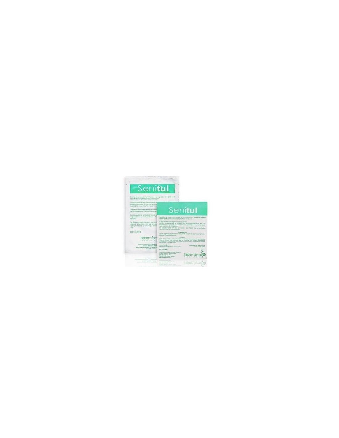 SENITULApósito impregnado para regenerar la piel. El principal ingrediente de Senitul es el FCE (Factor de Crecimiento Epidérmico), proteína que favorece la regeneración debido a una serie de reacciones que se producen en dermis y epidermis. El FCE relanza el proceso de cicatrización en las heridas crónicas debido a que promueve un efecto antioxidante por estímulo del sistema SOD. Favorece la proliferación de fibroblastos y queratinocitos así como el aumento de la síntesis de colágeno y elastina, sustancias estas fundamentales en la regeneración de los tejidos. Acelera, por tanto, la renovación celular epidérmica. El uso de Senitul está especialmente indicado para quemaduras y dermoabrasiones, heridas traumáticas, después de peeling, laserterapia, llagas por decubito