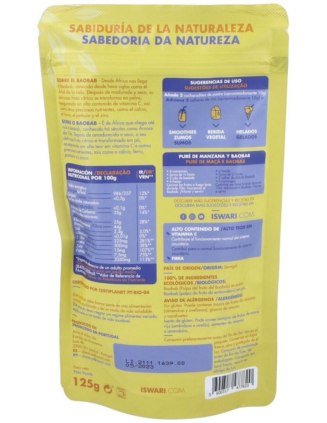 El Baobab en Polvo Bio 125G de Iswari aporta una opción natural para enriquecer la dieta con fibra y nutrientes, adaptándose a diferentes necesidades y preferencias alimentarias.