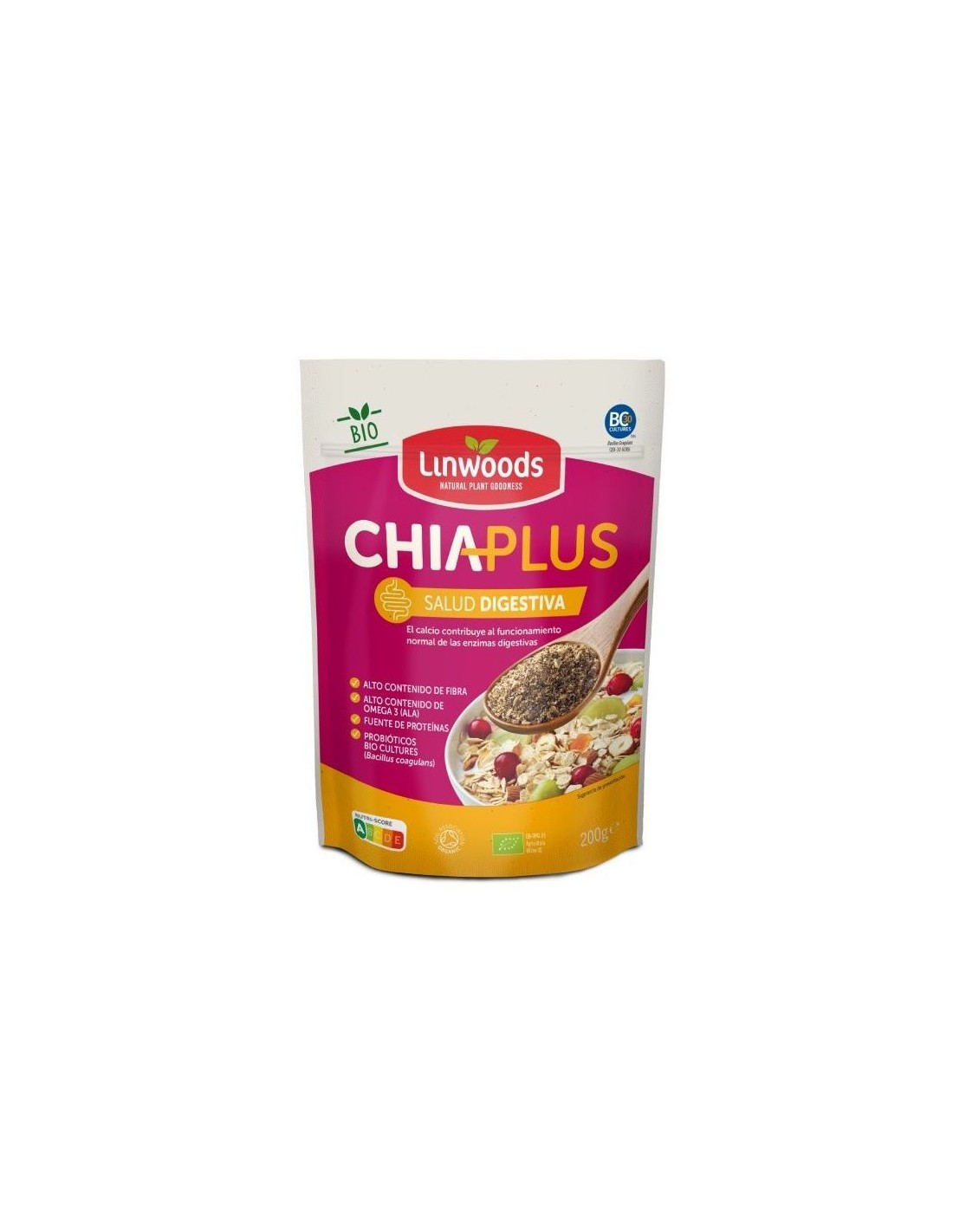 ChiaPlus Salud Digestiva de Linwoods, es una sabrosa mezcla de origen vegetal de semillas de chía molidas, semillas germinadas, cereales y probióticos