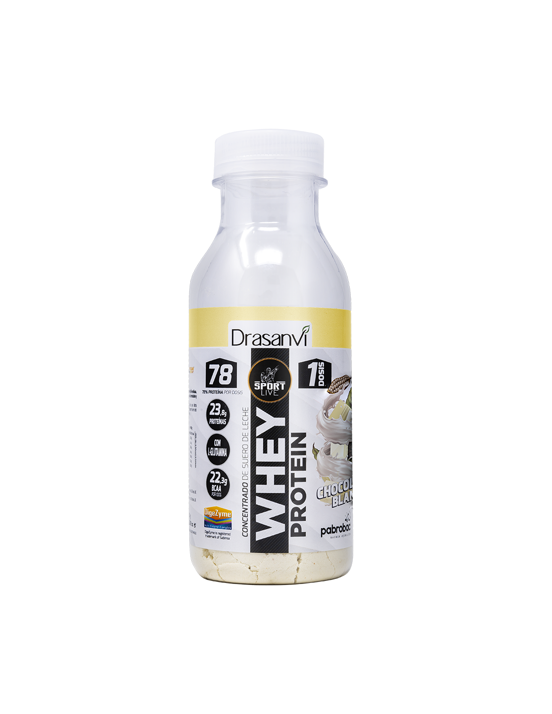 DRASANVI SPORT LIVECaracterísticas y Beneficios de la Botella Monodosis Whey Protein Concentrado Chocolate Blanco 30G Sport Live Drasanvi