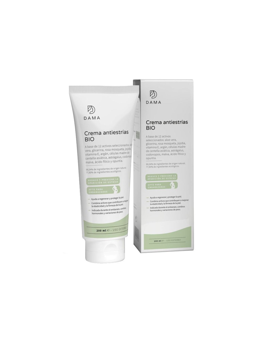 Ingredientes (INCI):Aloe Barbadensis Leaf Juice*, Decyl Oleate, Glycerin*, Glyceryl Stearate Se, Aqua, Cetyl Alcohol, Rosa Moschata Oil*, Butyrospermum Parkii Butter*, Glyceryl Caprylate, Potassium Cetyl Phosphate, Xanthan Gum, Tocopherol, Glyceryl Undecylenate, Argania Spinosa Kernel Oil*, Centella Asiatica Callus Conditioned Media, Astragalus Membranaceus Root Extract, Codonopsis Pilosula Extract, Centella Asiatica Extract*, Malva Sylvestris Flower Extract*, Opuntia Ficus Indica Seed Oil*, Phytic Acid, Citric Acid, Benzyl Alcohol, Potassium Sorbate, Sodium Benzoate, Parfum. (*) Ingredientes provenientes de agricultura ecológica.Modo de empleo:Aplicar dos veces al día (mañana y noche) sobre la zona a tratar (vientre, muslos, cadera, pechos, etc.) efectuando un ligero masaje hasta la completa absorción. En caso de embarazo comenzar el tratamiento a partir del segundo mes.Presentación:Envase de 200 ml.Recomendaciones y advertencias:No aplicar sobre heridas abiertas. No aplicar en niños menores de 3 años.