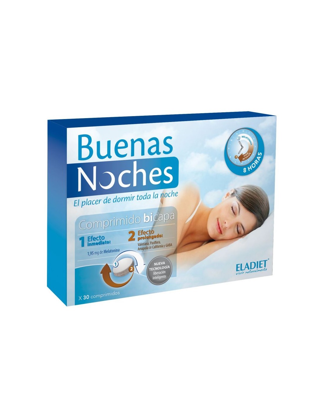 Ingredientes:Estabilizante: celulosa microcristalina; extracto seco de flores de pasiflora (2% flavonoides) (Passiflora incarnata); extracto seco de raíz de valeriana (0,4% ácido valerénico) (Valeriana officinalis); GABA (ácido gamma amino butírico); estabilizante: hidroxipropilcelulosa; extracto seco de partes aéreas de amapola de california (Escholtzia californica); niacina (vitamina B3); antiaglomerante: dióxido de silicio; estabilizante: hidroxipropilmetilcelulosa; almidón de patata; estabilizante: estearato de magnesio; melatonina; piridoxina (vitamina B6); antiaglomerante: ácido esteárico. Modo de empleo:Tomar 1 comprimido al día por la noche, media hora antes de acostarse. Presentación:Envase de 30 comprimidos.Recomendaciones y advertencias:No contiene gluten, lactosa ni azúcares añadidos.