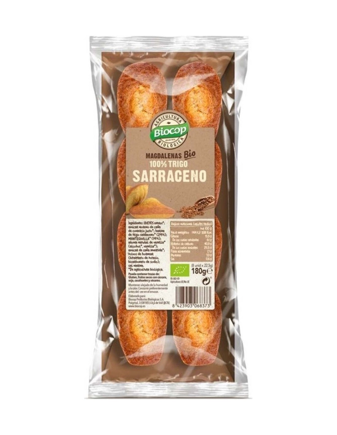 BIOCOPMagdalenas de trigo sarraceno 100%. Sabrosas y elaboradas con ingredientes naturales y de origen ecológico. Con azúcar de caña de comercio justo. Huevos de corral ecológicos. Sin aceite de palma. Cada paquete contiene 8 magdalenas.