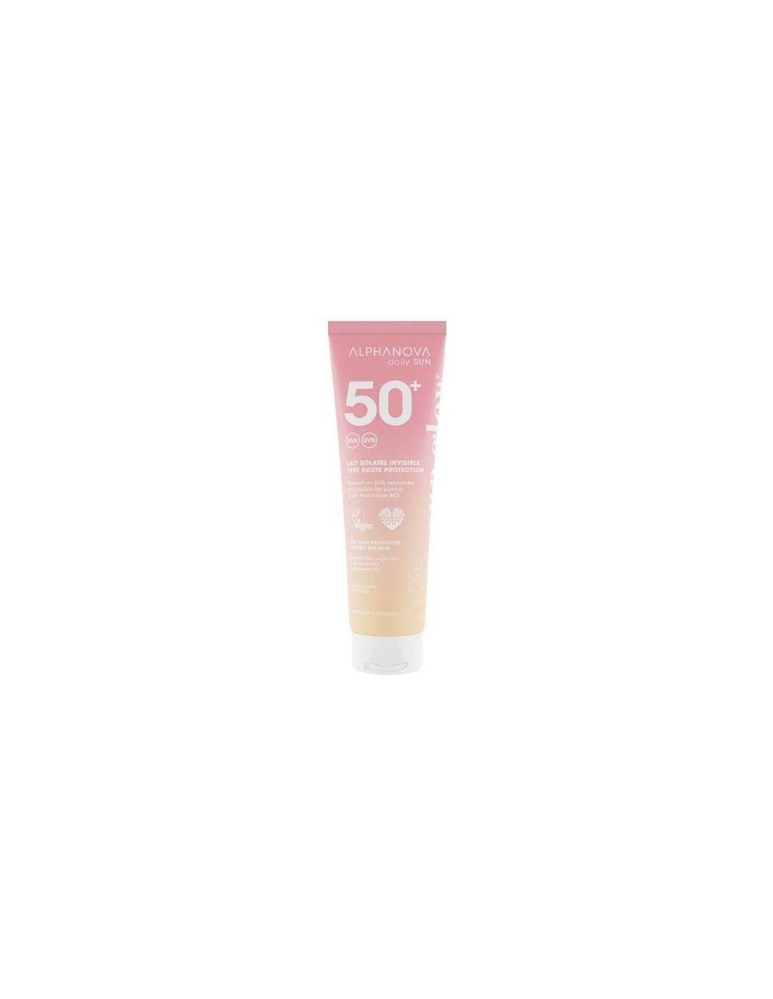 Una leche solar invisible de muy alta protección SPF 50+ y eco-responsable. Con una fórmula resistente al agua, filtros de nueva generación y enriquecida con aceite de jojoba orgánico y aceite de frambuesa orgánico. La primera protección solar pensada para reducir los efectos creados por los rayos UVA, para luchar contra el envejecimiento de la piel y las manchas marrones. Sin marcas blancas, esta leche solar contiene más de un 74% de ingredientes de origen natural y un 39% de ingredientes orgánicos. Esta protección solar aporta a la piel una sensación de hidratación y calma para disfrutar de un día caluroso. Alphanova Daily Sun® innova con su nuevo complejo UVA Boost que garantiza, por primera vez, una protección contra los UVA 2 veces mayor que el estándar europeo: nuestra protección contra los UVA es tan importante como la contra los UVB. Como resultado, la piel está mejor protegida, lo que reduce el envejecimiento cutáneo y las manchas marrones relacionadas con la exposición.Ventajas: