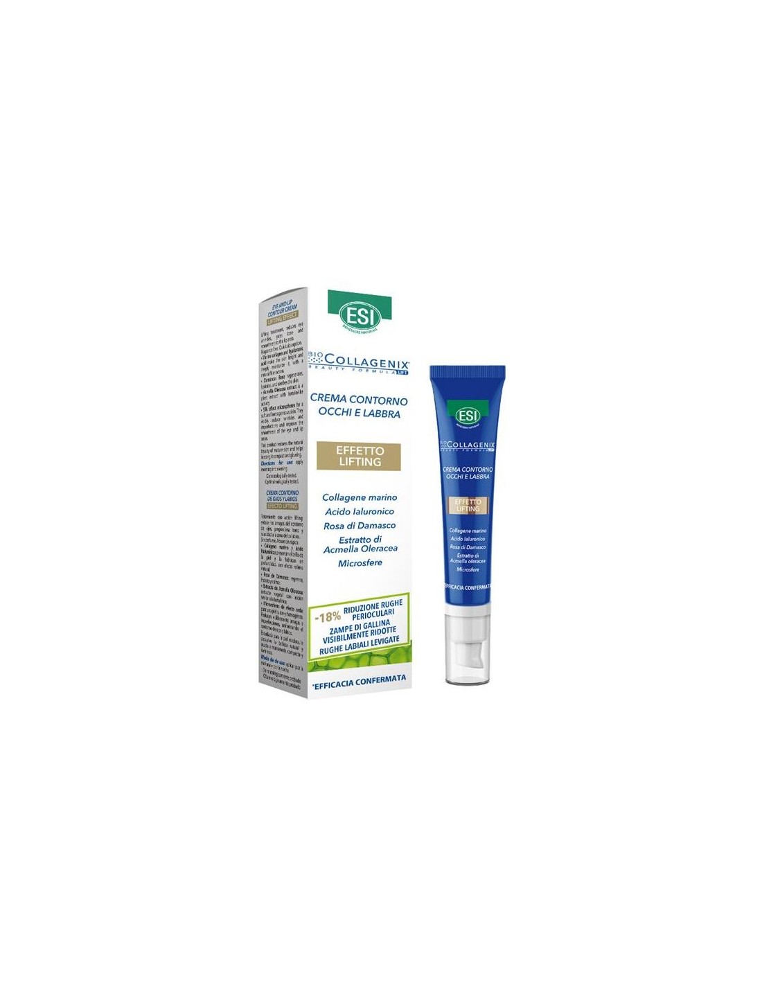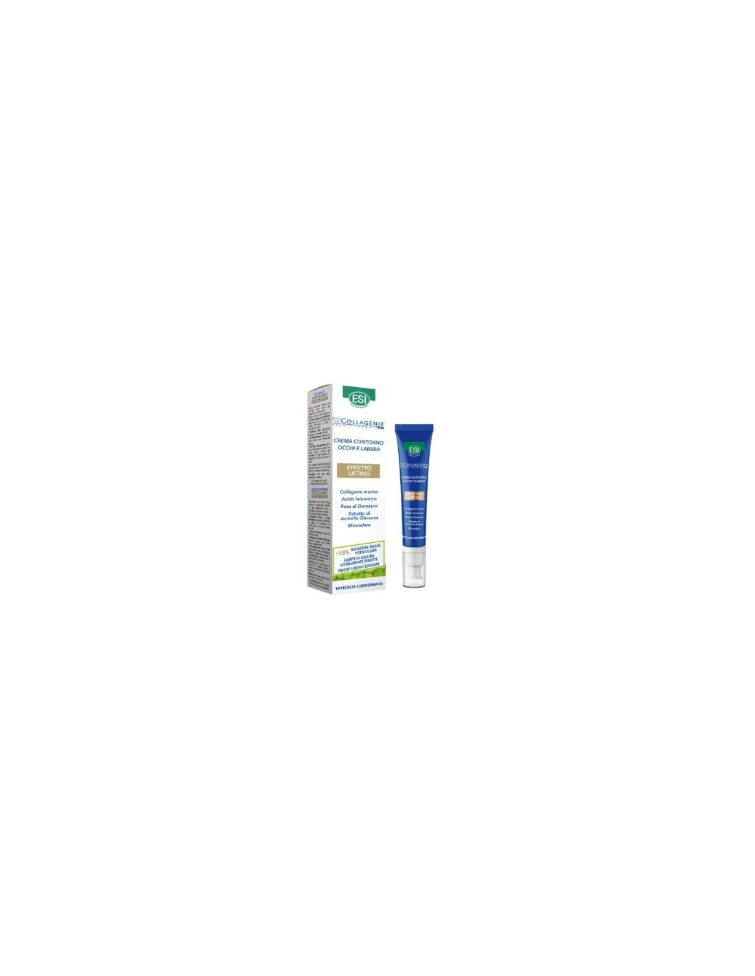 Collagenix Contorno de Ojos de ESI es un producto con función global, trata bolsas, ojeras y arrugas del contorno de ojos y labio con efecto lifting. Reduce las arrugas del contorno de ojos, proporciona hidratación y suavidad a la zona de los labios.Combina Colágeno marino y ácido hialurónico con un extracto de Acmella Oleracea que presenta una acción Botox like y un concepto innovador en el relleno de arrugas especialmente diseñado para rellenar instantáneamente las arrugas y las líneas finas de una manera más eficiente, Microesferas de efecto seda.Disminuye un -18% de reducción alrededor de los ojos, patas de gallo visiblemente reducidas, arrugas de labios suavizadas.Prolonga la elasticidad de la piel, previene la aparición de arrugas, aumenta la consistencia de los tejidos y crea una mejor resistencia a la evaporación de agua. El colágeno marino favorece la regeneración positiva de las células de la dermis.Ingredientes (INCI):Aqua, caprylic/capril triglyceride, glycerin, hidrogenated coconut oil, isostearyl isostearate, C10-18 Triglycerides, triethylhexanoin, sea butter ethyl esters, cetyl alcohol, candelilla/jojoba/rice Bran polyglyceryl-3 esters, sodium potassium alluminum silicate, butylene glycol, microcrystaline cellulose, glyceryl stearate, canola oil, rosa damascena flower extract, hydrolyzed collagen, sodium hyaluronate, hydrolyzed hyaluronic acid, hydrolysed yeast protein, 1-2 hexanediol, acacia Senegal Gum, ammonium glycirrhizate, caléndula officinalis flower extract, centella asiática extract, ascorbyl palmitate, ruscus aculeatus root extract, spilanthes acmella flower extract, scin, lecithin, panthenol, caprylyl glycol, cellulose gum, cetaryl alcohol, ethylexyl palmitate, ethylexylglycerin, glucomannan, helanthus annuus seed oil, isohexadecane, polysorbate 80, sorbitan oleate, polyvinyl alcohol, propylene glycol, silica, sodium acrylate/sodium acryloyldimethyl taurate copolymer, sodium citrate, sodium stearoyl lactylate, tetrasodium edta, tocopherol, trihydroxystearin, xanthan gum, citric acid, sodium dehydroacetate, phenoxyetanol, Cl 77891.Modo de empleo:Seguir las instrucciones de aplicación indicadas en el envase.Presentación:Envase de 15 ml.Recomendaciones y advertencias:No contiene parabenos, siliconas ni perfumes. Dermatologicamente testado.