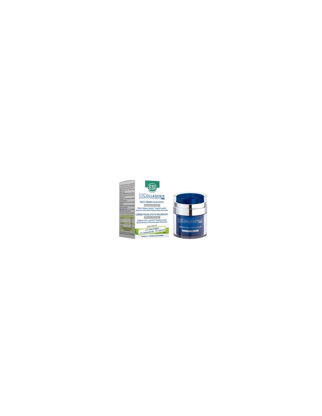 Collagenix Crema Efecto Botox de ESI es un producto con efecto relleno, enriquecida con un complejo de ingredientes específicos con acción similar a la botulínica y bioactivos naturales para tensar y reafirmar la piel.Inspirada en la fórmula del Sérum, actúa sobre los elementos esenciales como el colágeno y la elastina, así como sobre las glicoproteínas que los conectan gracias a la presencia de los péptidos y polisacáridos naturales.La piel recupera firmeza, elasticidad y vitalidad para un efecto lift integral. El Ácido hialurónico de diferentes pesos moleculares hidrata la piel y proporciona un efecto relleno y la Niacinamida aporta luminosidad a la piel y mejora la función barrera.Desde la primera aplicación la piel adquiere un aspecto más terso y relleno y las arrugas se hacen menos visibles. Reduce -23% las arrugas del labio superior, -22% las arrugas de la frente y -20% las de las patas de gallo.Ingredientes:Aqua, glyceryl stearate, C15-19 Alkane, niacinamide, caprylyc/capric tryglyceride, butyrospermum parky butter, PEG-100 stearate, diethylhexyl carbonate, glycerin, C10-18 Triglycerides, sodium polyacryloyldimethyl taurate, pentylen glycol, polymethylsilsesquioxane, phenoxyetanol, parfum, hdi/trimethylol hexyllactone crosspolymer, avena sativa kernel extract, ethylexylglycerin, hydrolyzed glycosaminoglycans, citric acid, sodium hyaluronate, hydrolyzed hyaluronic acid, lecithin, caprylyl glycol, hydrolyzed collagen, tocopherol, ascorbyl palmitate, acetyl hexapeptide-8.Modo de empleo:Seguir las instrucciones de aplicación indicadas en el envase.Presentación:Envase de 50 ml.Recomendaciones y advertencias:No contiene parabenos ni siliconas.