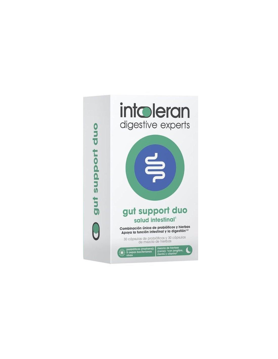 Intoleran gut support duo contiene una combinación de probióticos y hierbas para apoyar la función intestinal y la digestión. Consta de dos tipos de cápsulas: cápsulas probióticas para la mañana y cápsulas de mezcla de hierbas para favorecer la función intestinal y la digestión por la noche.Probióticos (mañana): cápsulas gastro-resistentes con 5 cepas bacterianas cuidadosamente seleccionadas, que aportan 12 mil millones de bacterias beneficiosas por cápsula.Mezcla de hierbas (noche): cápsulas que contienen una mezcla de jengibre, menta y cilantro para favorecer la función intestinal. Además, las cápsulas contienen el aminoácido L-glutamina.Composición activa:Por cápsula de hierbas: