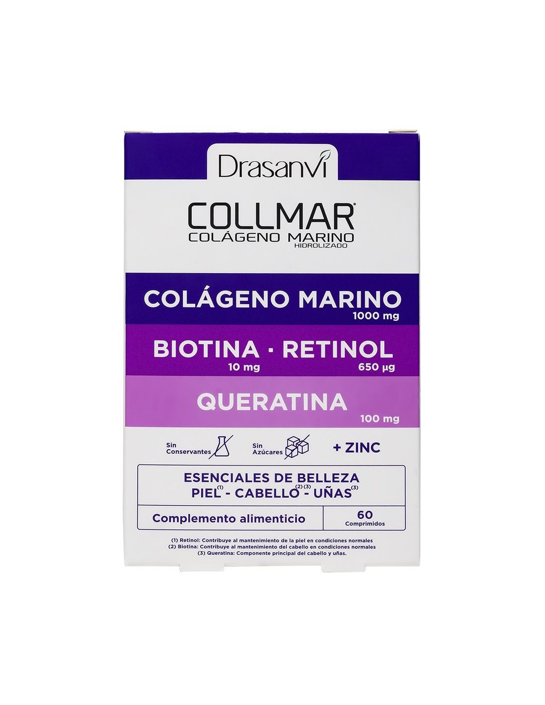Collmar Esenciales Belleza de Drasanvi es una potente fórmula que combina colágeno, queratina, biotina, vitamina A, vitamina B6 y zinc, cuidadosamente seleccionados para fortalecer y embellecer tu cabello, uñas y piel desde adentro hacia afuera.El colágeno y la queratina trabajan en sinergia para fortalecer y revitalizar el cabello, mientras que la biotina estimula su crecimiento. Las vitaminas A y B6, junto con el zinc, promueven una piel radiante y uñas fuertes. Descubre el secreto para lucir un aspecto saludable y vibrante con nuestro complemento alimenticio de confianza.Composición activa por 2 comprimidos:
