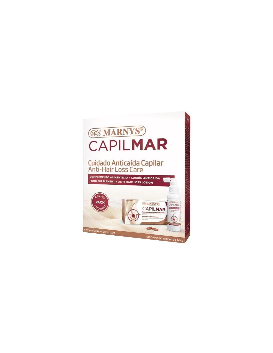 El Pack Ahorro Capilmar de Marnys ayuda a reparar el cabello desde la raíz, es un cuidado intensivo para 30 días combinando Capilmar de 60 cápsulas y Capilmar loción anticaída.1x Capilmar · 60 cápsulasPrincipios activos: