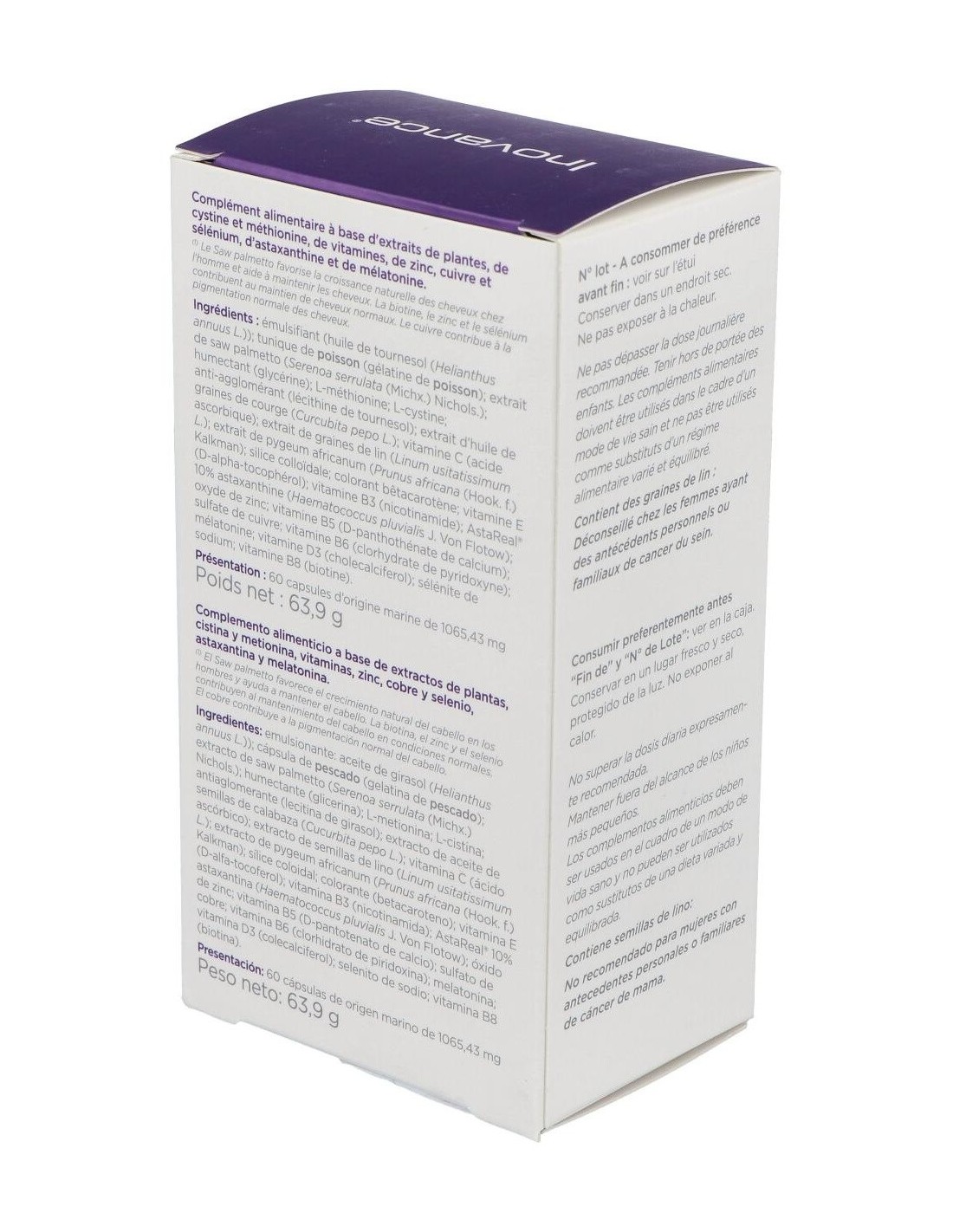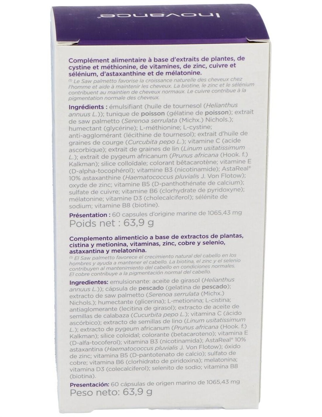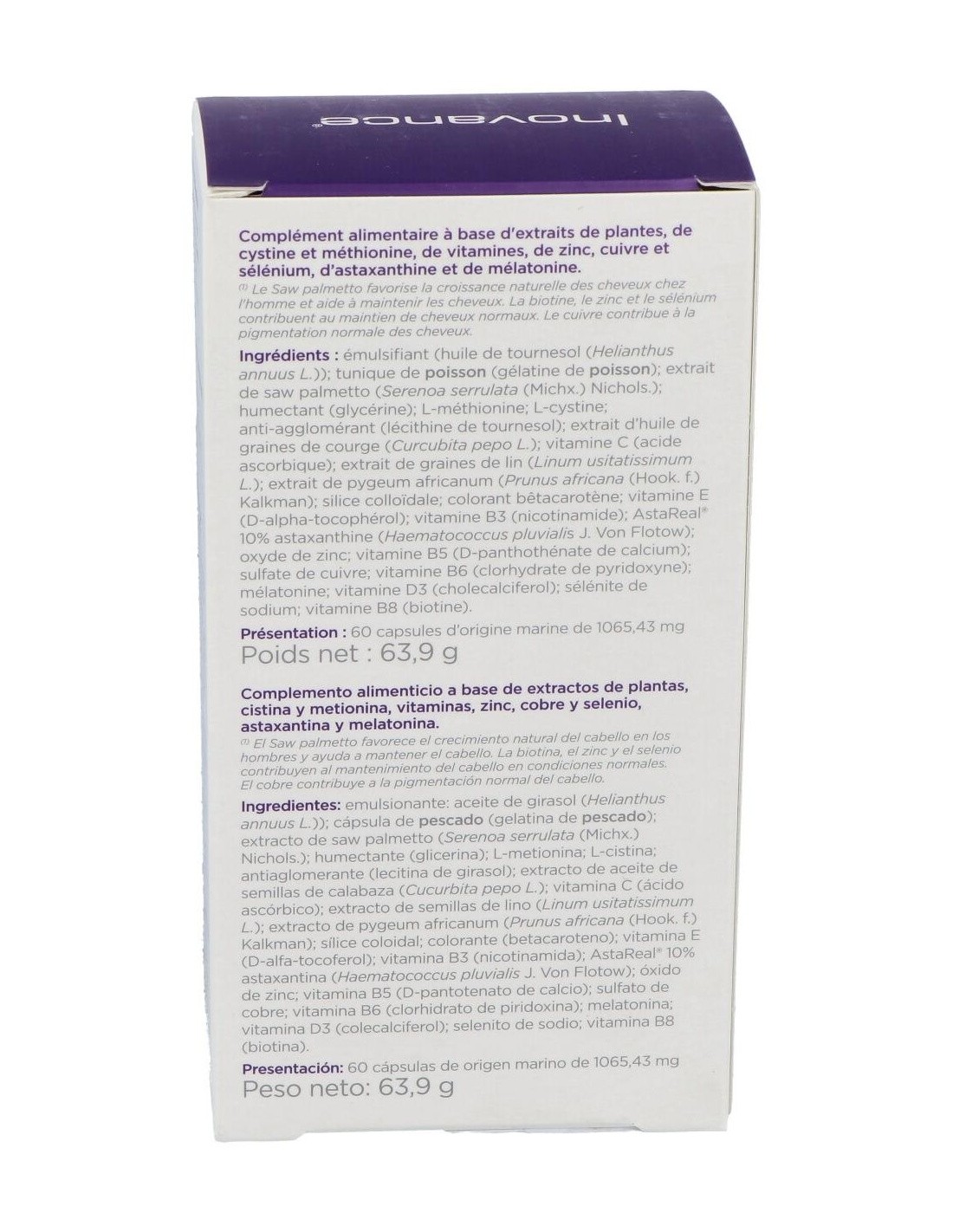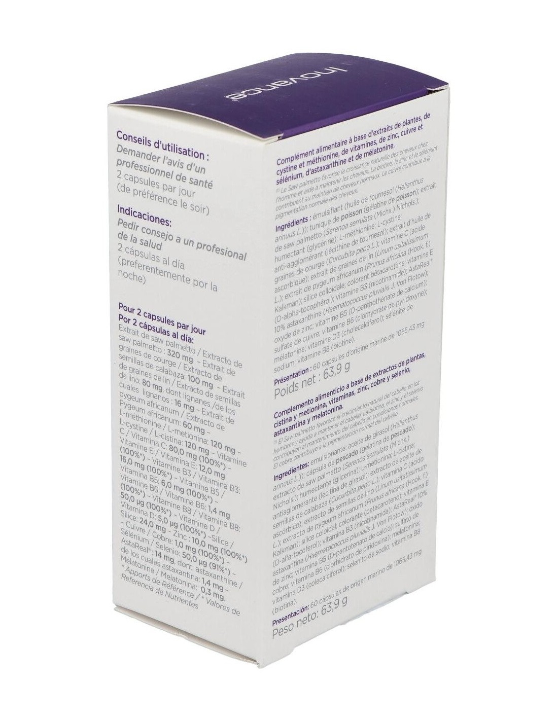 Suplemento micronutricional que aporta micronutrientes específicos para el cabello, agentes antioxidantes y cronorreguladores del ciclo piloso. Con un total de 4 extractos de plantas, especialmente con Saw Palmetto, presente en gran cantidad, el cual actúa de forma sinérgica sobre la enzima responsable de la debilidad capilar y la caída del cabello. Las vitaminas, minerales y aminoácidos seleccionados para esta formulación tienen una acción complementaria con los extractos de las plantas para asegurar el mantenimiento y la densidad del cabello.