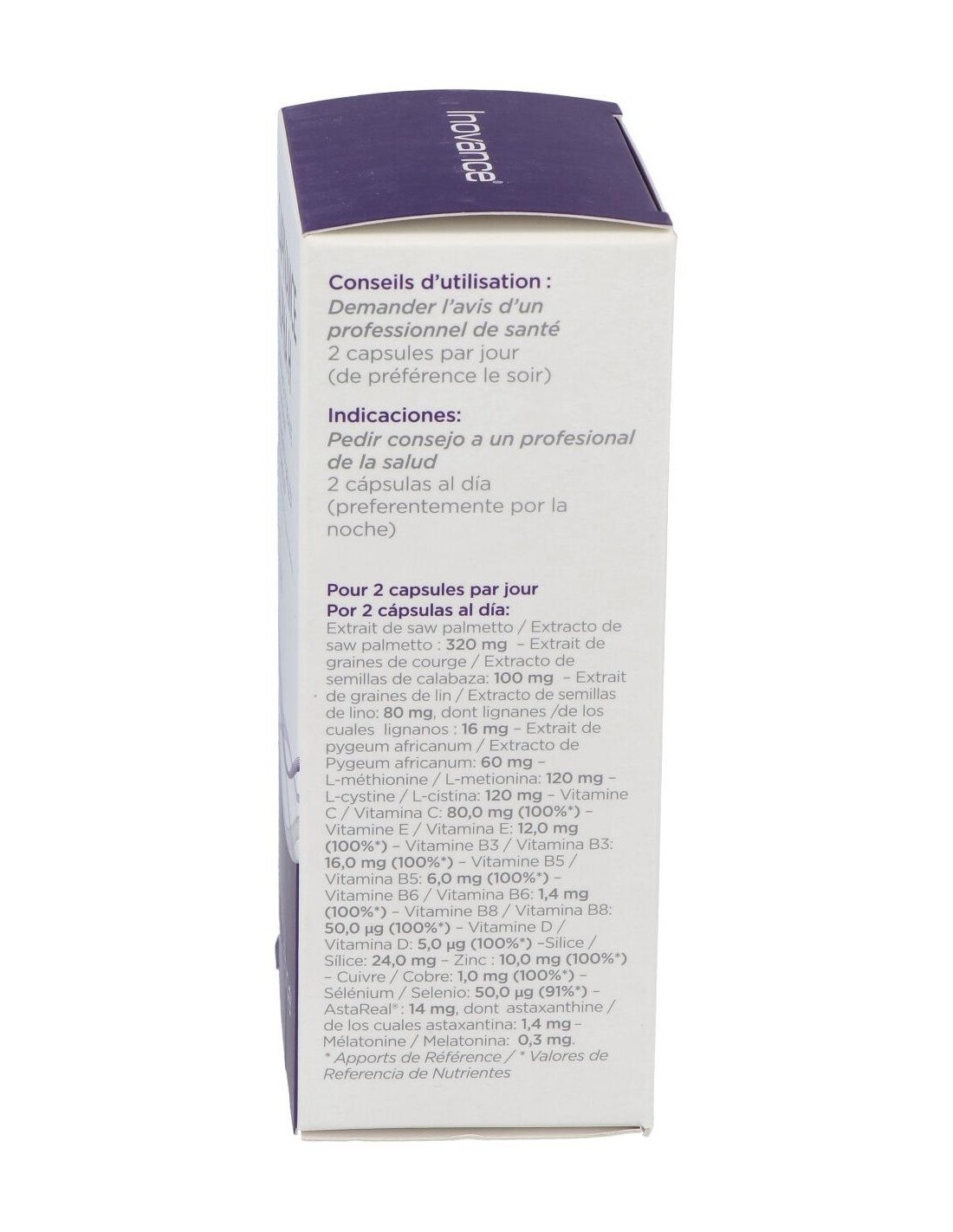 Extracto de saw palmetto: 320 mg Extracto de semillas de calabaza: 100 mg Extracto de semillas de lino: 80 mg, de los cuales lignanos: 16 mg Extracto de Pygeum africanum: 60 mg L-metionina: 120 mg L-cistina: 120 mg Vitamina C: 80,0 mg Vitamina E: 12,0 mg Vitamina B3: 16,0 mg Vitamina B5: 6,0 mg Vitamina B6: 1,4 mg Vitamina B8: 50,0 µg Vitamina D: 5,0 µg Sílice: 24,0 mg Zinc : 10,0 mg Cobre: 1,0 mg Selenio: 50,0 µg AstaReal®: 14 mg, de los cuales astaxantina: 1,4 mg Melatonina: 0,3 mg.