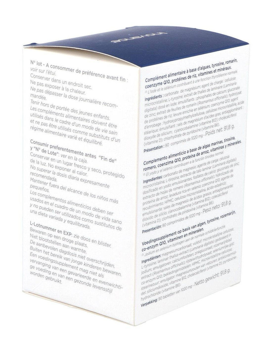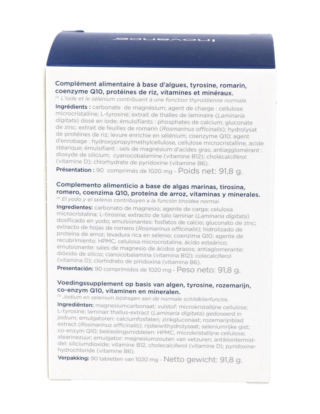 Complemento alimenticio a base de algas marinas ricas en iodo, tirosina, romero, coenzima Q10, zinc, selenio, vitaminas B6-B12-D. Ayuda a reforzar la tiroide.