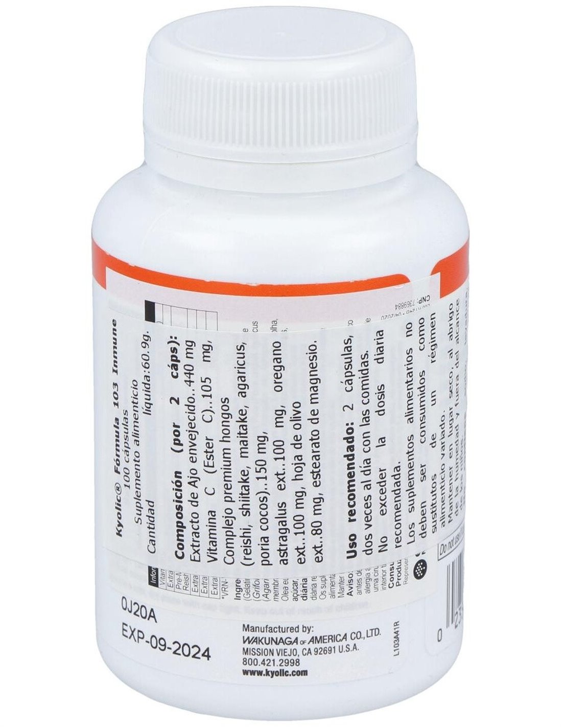 Vitamina C (Ester C®) 700 mg, extracto de ajo envejecido Kyolic® 440 mg, complejo Premium Hongos (shiitake, maitake, poria cocos, reishi, agaricus) 150 mg, Astrágalo raíz ext 100 mg, Orégano hoja ext 100 mg, Olivo hoja ext 80 mg. Otros: Gelatina, estearato de magnesio (origen vegetal).