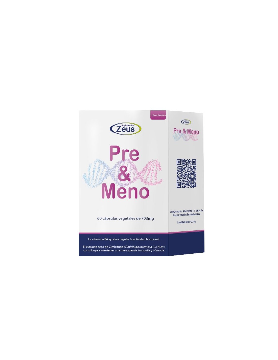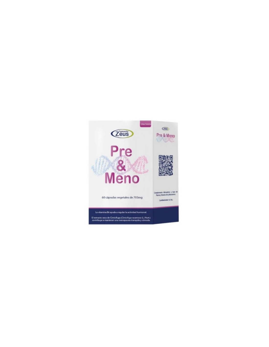 Pre&Meno de Zeus es un complemento alimenticio a base de Cimicífuga, Lúpulo, Trébol rojo, Vitamina B6 y Melatonina. La Cimicífuga actúa reduciendo los sofocos, la depresión, la atrofi a vaginal y la osteoporosis. El Lúpulo disminuye los sofocos, evita la pérdida de densidad ósea, mejora el metabolismo de los estrógenos y el estado ansioso/depresivo.El Trébol rojo gracias a sus fitoestrógenos naturales reduce los sofocos, la sequedad vaginal y mejora el metabolismo óseo. La Vitamina B6 regula los ciclos menstruales, la secreción de serotonina, dopamina y aumenta la libido. La Melatonina favorece un sueño reparador y ejerce un efecto ansiolítico.Propiedades: