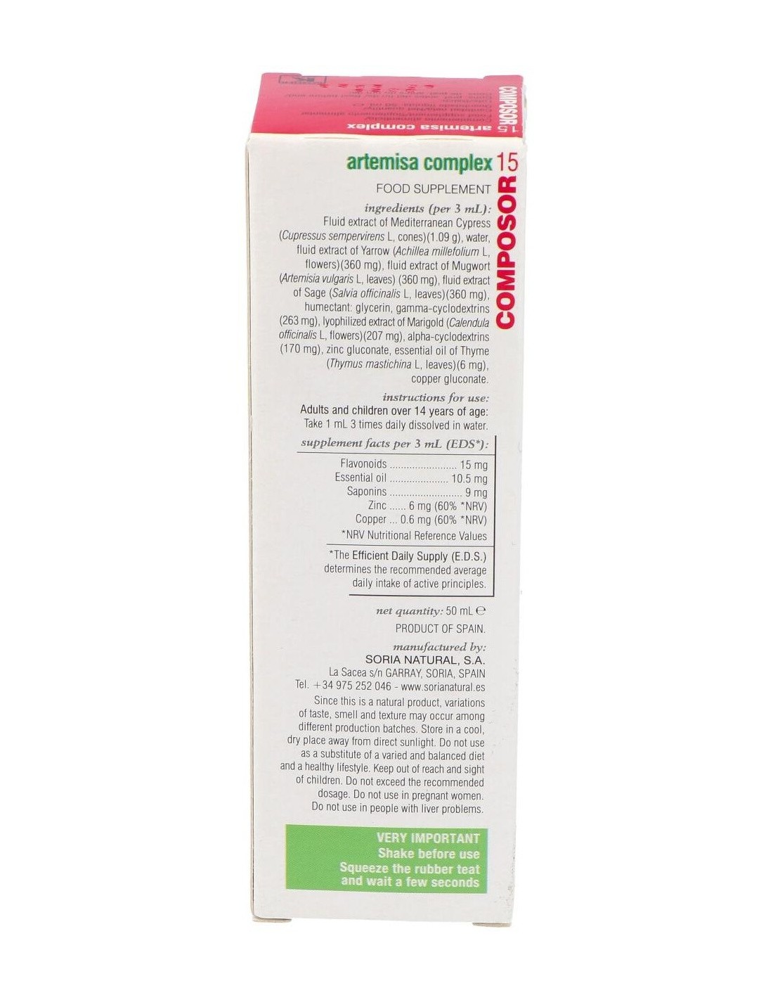 Composor 15 Artemisa Complex Xxi 50Ml. de Soria Natural es un complemento natural diseñado para personas que buscan apoyar su bienestar diario mediante ingredientes botánicos seleccionados. Su formulación está pensada para integrarse fácilmente en rutinas de cuidado personal.
