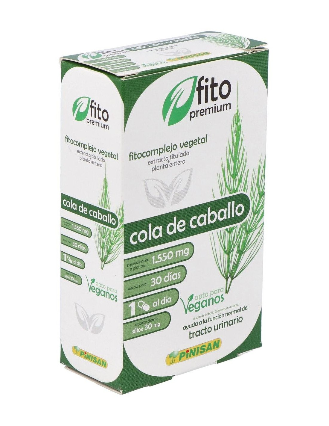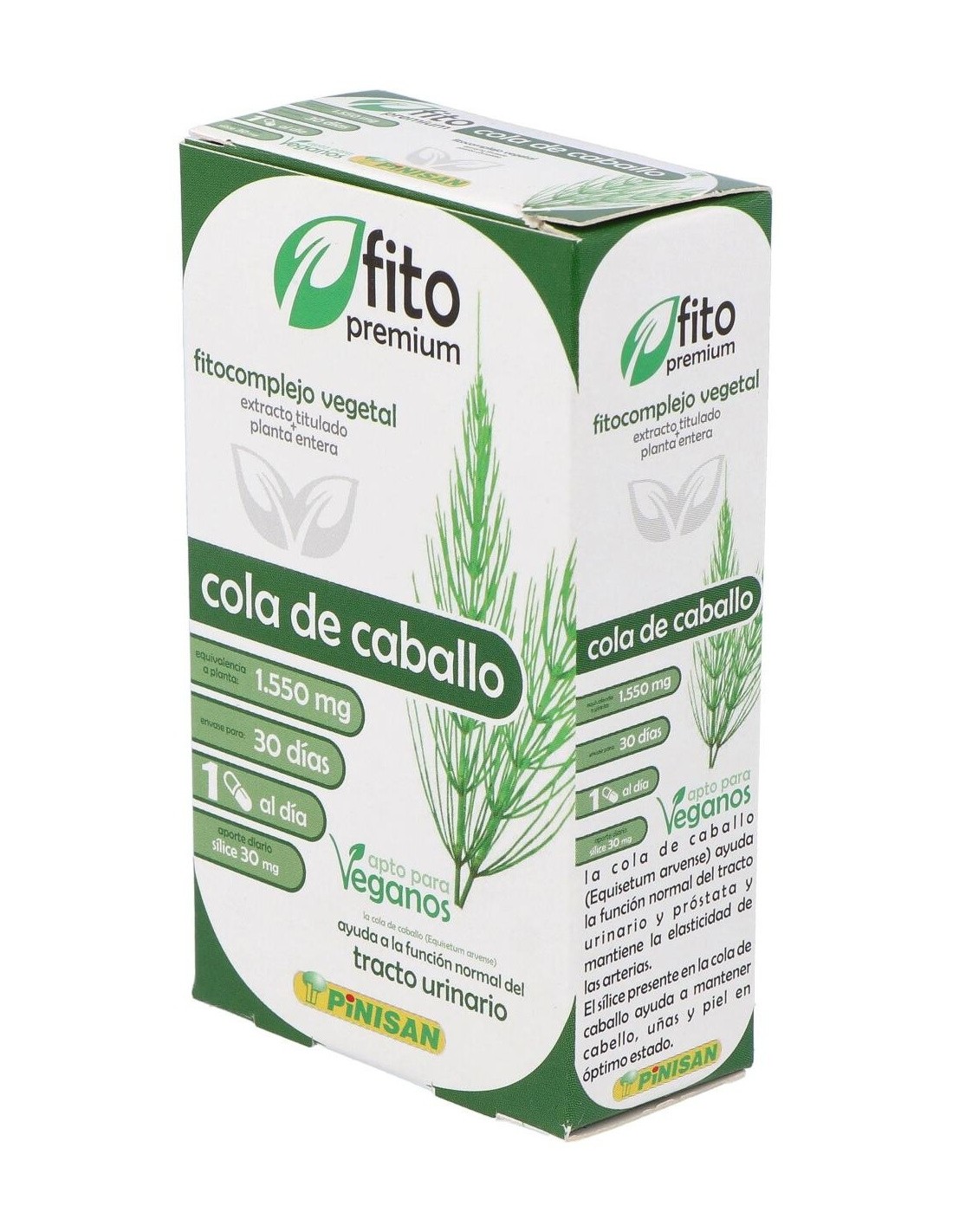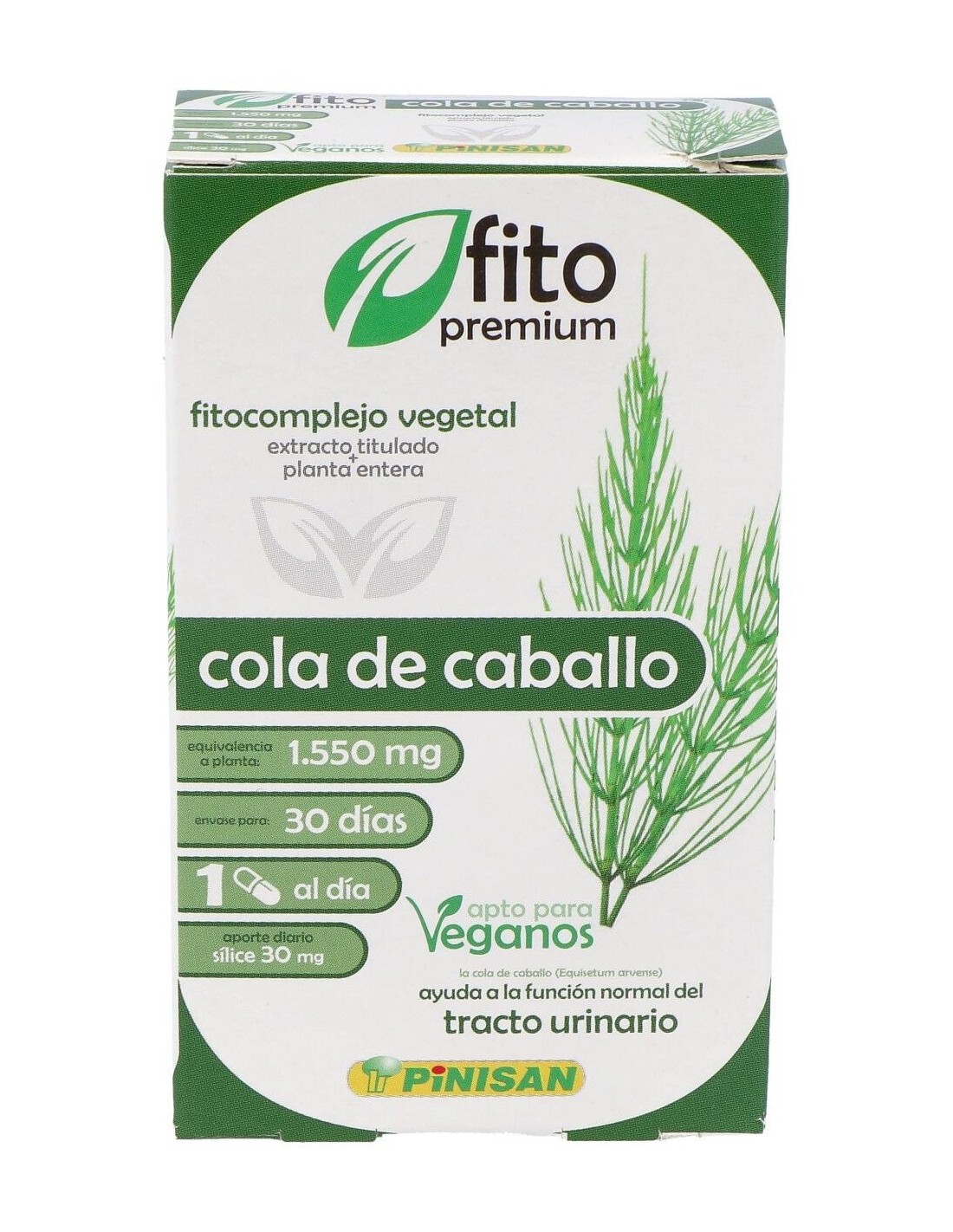 La cola de caballo es una planta sin flores que crece en lugares húmedos. Rica en potasio y sílice, siendo remineralizante en casos de fatiga, fractura o durante el embarazo, y diurética. Estimula la reconstrucción del cartílago en el caso de enfermedades articulares y actúa sobre la flexibilidad de tendones y paredes vasculares, por lo que resulta útil en deportistas. La cola de caballo se utiliza en el tratamiento de uñas y cabello frágil, problemas óseos, estrías y flaccidez. Los flavonoides que contiene le aportan propiedades diuréticas, muy útil en casos de retención de líquidos y cistitis. Composición activa por cápsula: