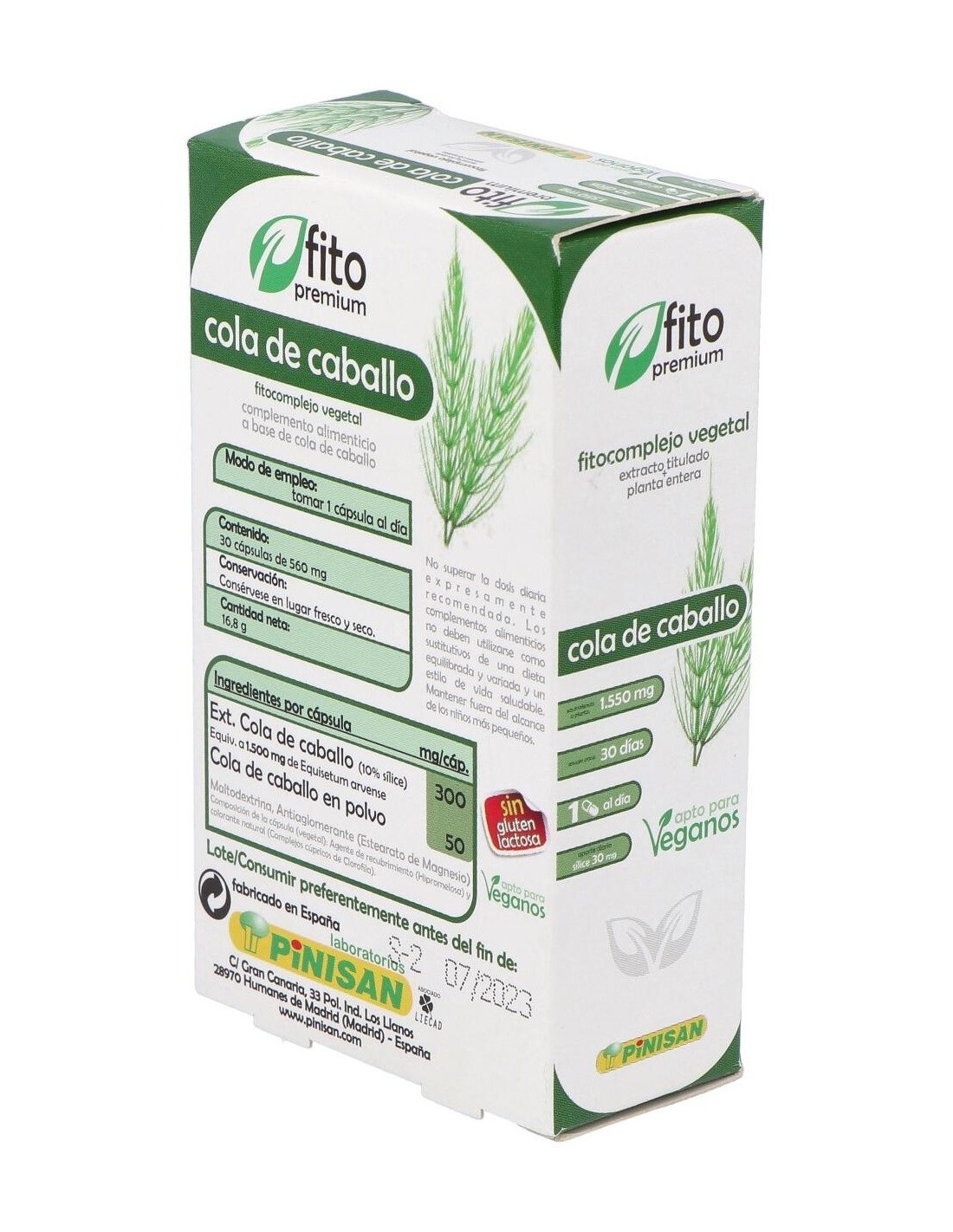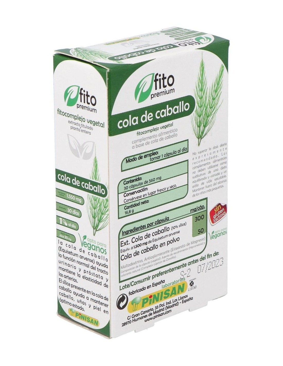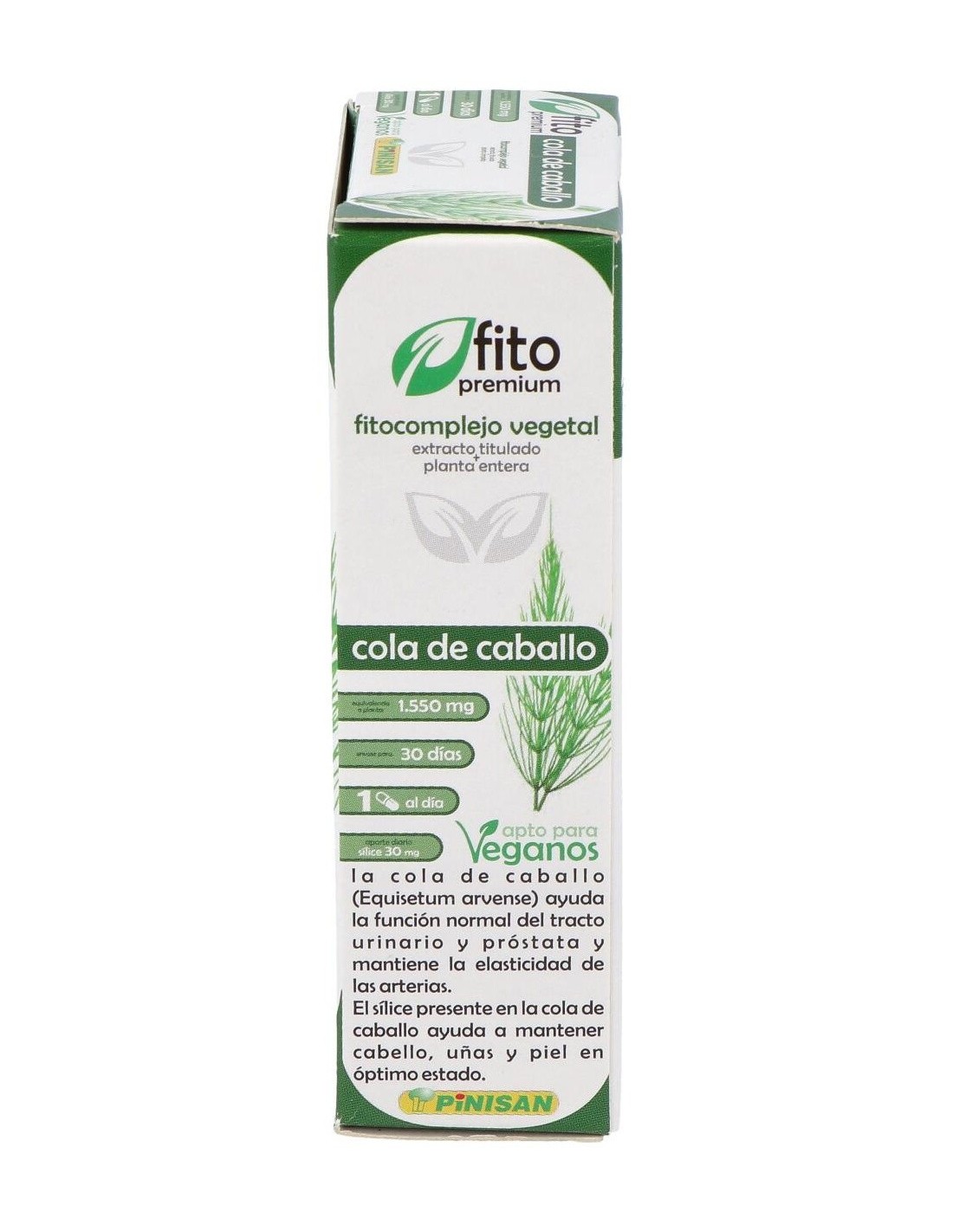 La cola de caballo es una planta sin flores que crece en lugares húmedos. Rica en potasio y sílice, siendo remineralizante en casos de fatiga, fractura o durante el embarazo, y diurética. Estimula la reconstrucción del cartílago en el caso de enfermedades articulares y actúa sobre la flexibilidad de tendones y paredes vasculares, por lo que resulta útil en deportistas. La cola de caballo se utiliza en el tratamiento de uñas y cabello frágil, problemas óseos, estrías y flaccidez. Los flavonoides que contiene le aportan propiedades diuréticas, muy útil en casos de retención de líquidos y cistitis. Composición activa por cápsula: