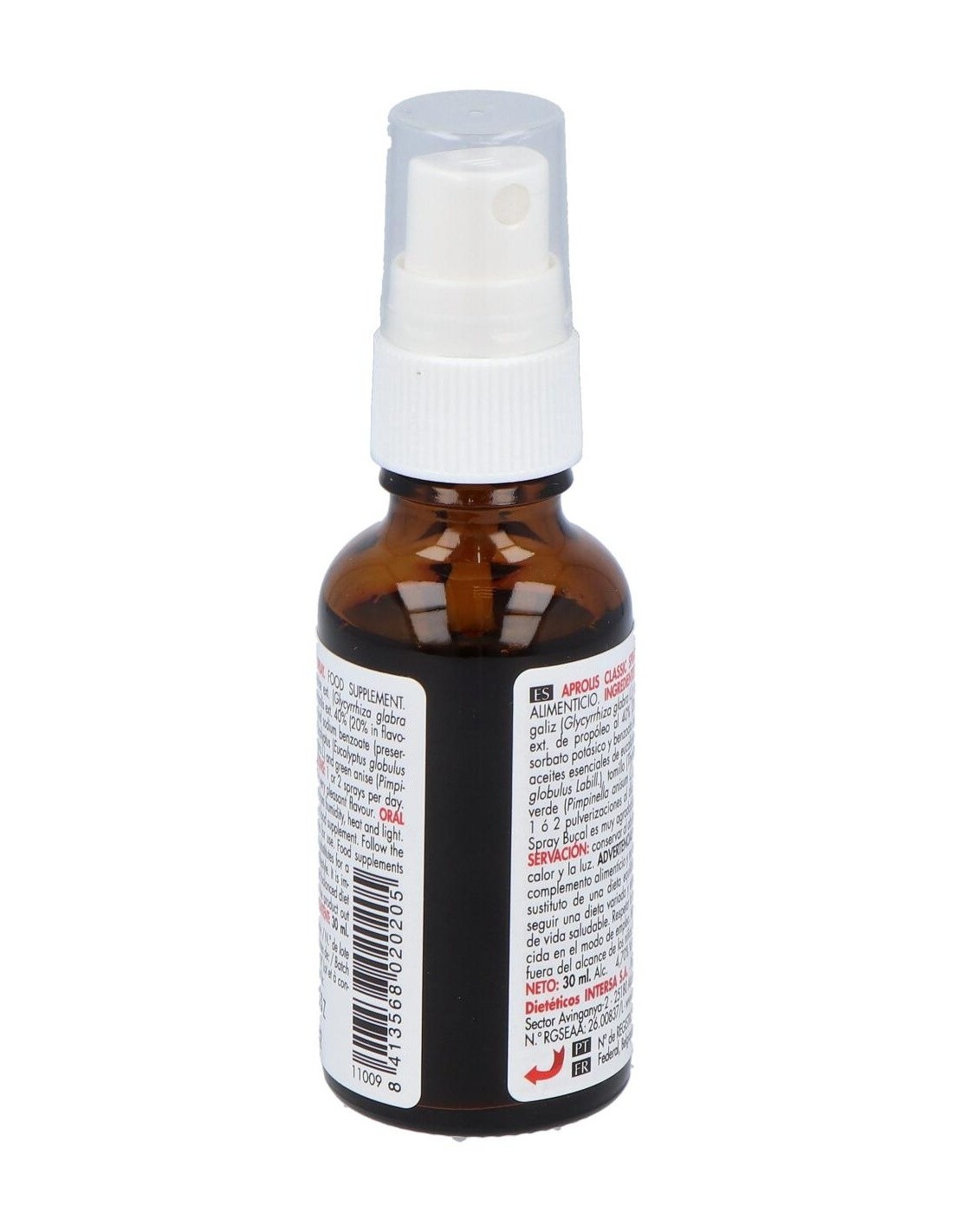 Este complemento nutricional es un spray bucal de própolis, tomillo, eucalipto, anís verde y regaliz. Es idóneo para afecciones en la cavidad bucal: g