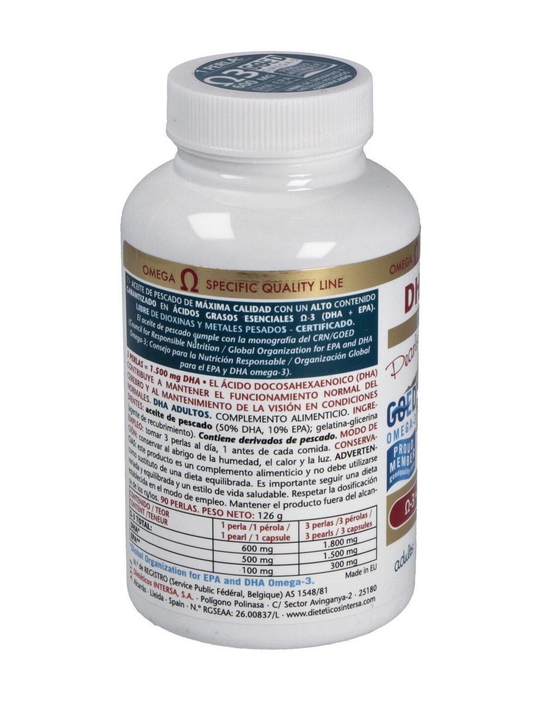 Excipientes: perlas de gelatina-glicerina (envoltura de la perla). Contiene derivados de pescado.