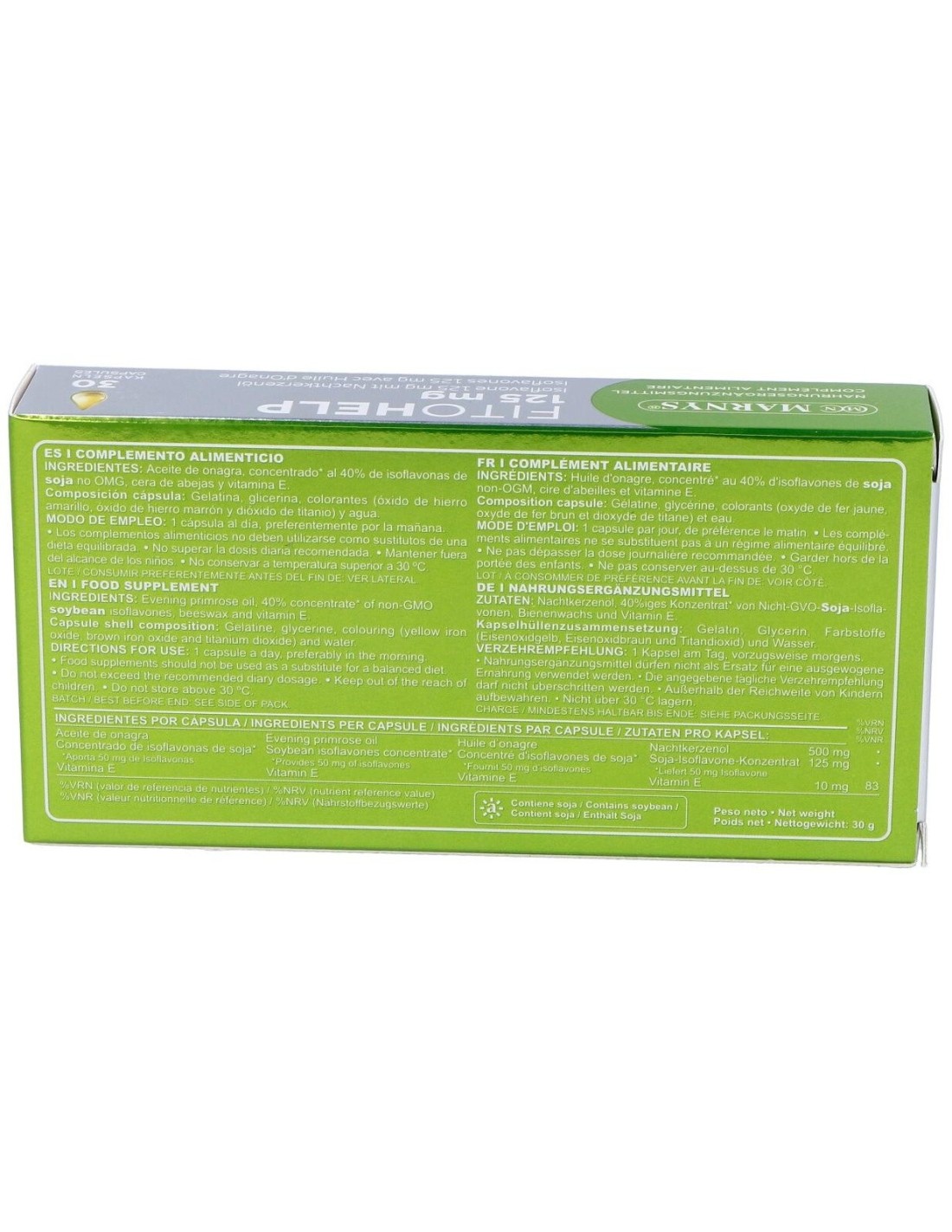 Fitohelp Isoflavonas Con Onagra 30Perlas de Marnys es un complemento alimenticio diseñado para personas que buscan apoyar su bienestar diario mediante ingredientes de origen natural. Está especialmente indicado para quienes desean incorporar isoflavonas y aceite de onagra en su rutina.